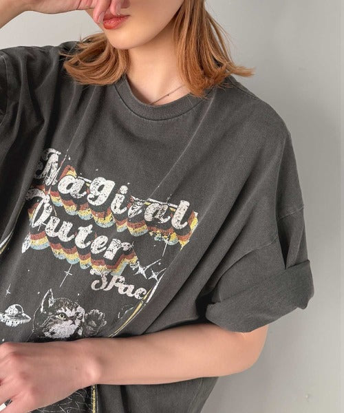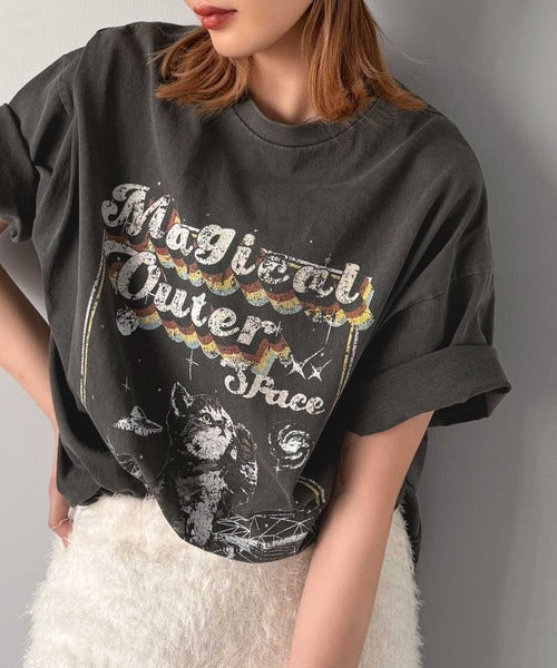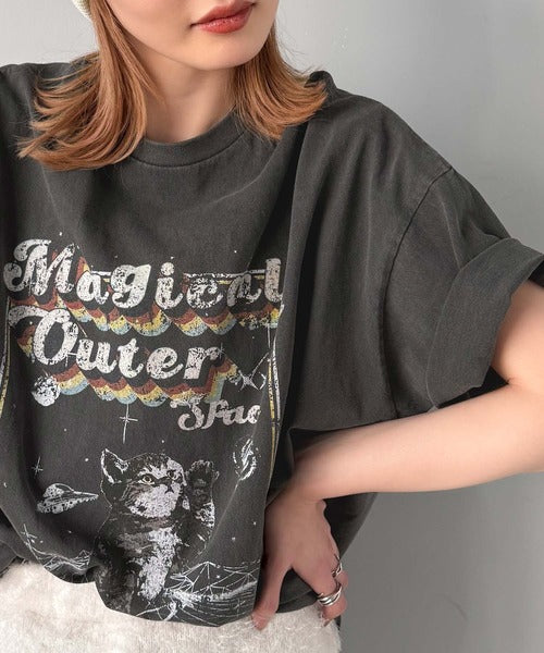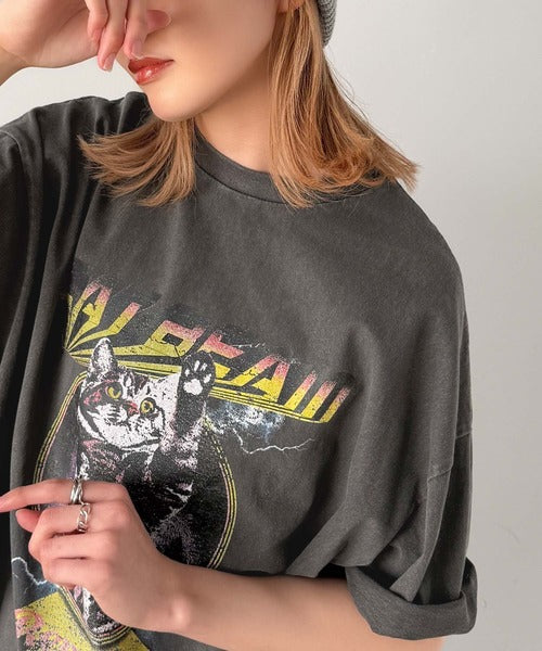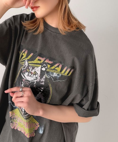 《JaVa ジャバコラボ》トレンド感のある猫モチーフ。綿100%ヴィンテージライクピグメントキャットプリントビッグTシャツ jv1029115