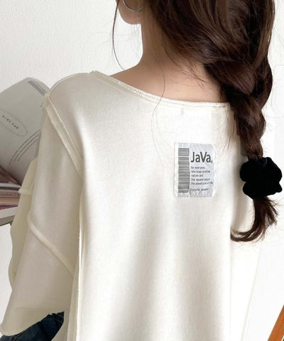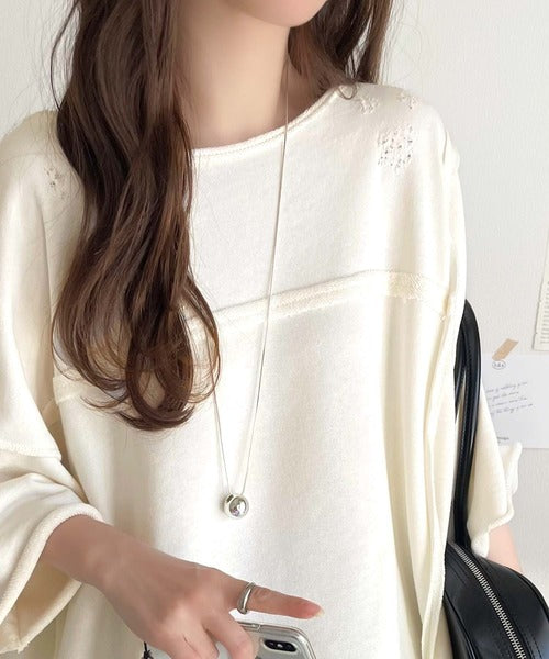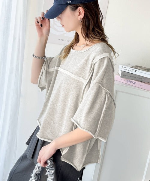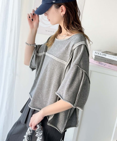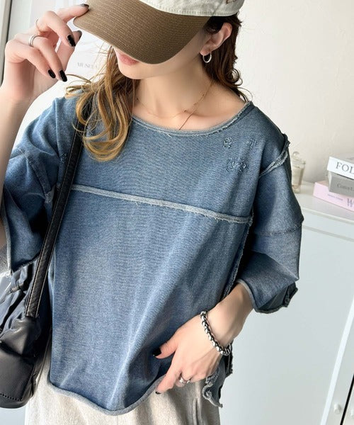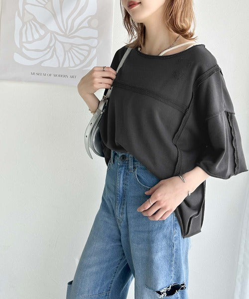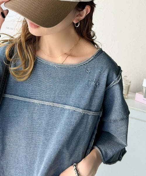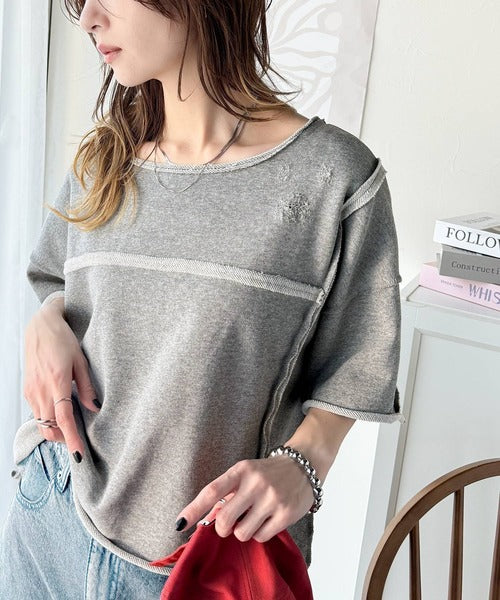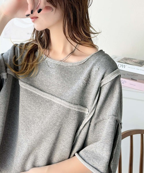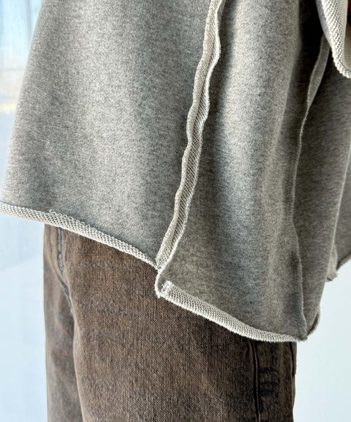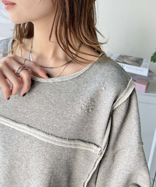 ダメージ加工と切りっぱなしデザインが今っぽい裏毛プルオーバー。