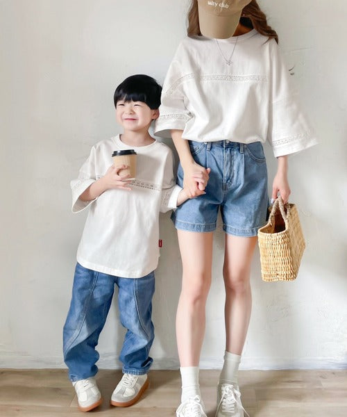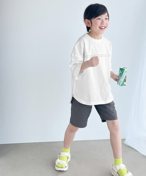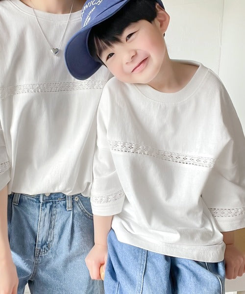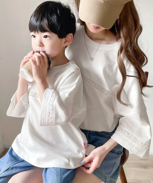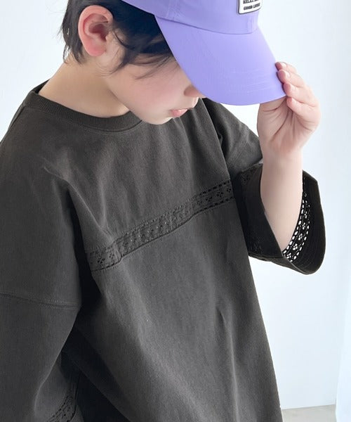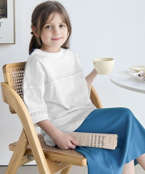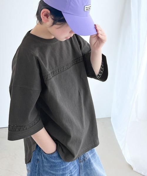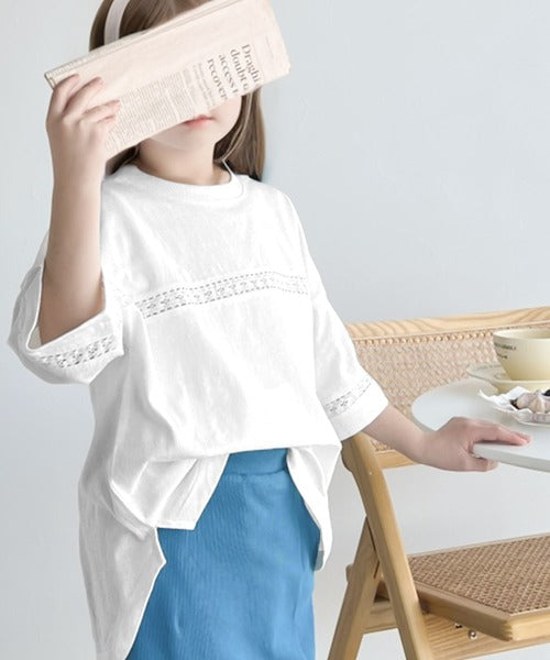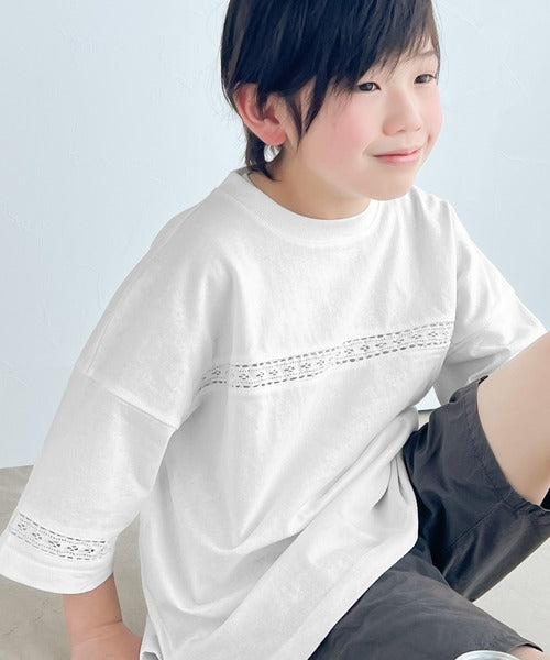 胸元と袖口にハシゴレースを使ったさり気ないポイントが大人顔負けのおしゃれTシャツ。