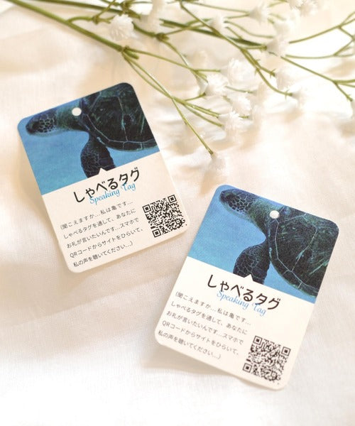 ウミガメが商品を購入してくれたことへの御礼をしゃべる「しゃべるタグ」が付きます。