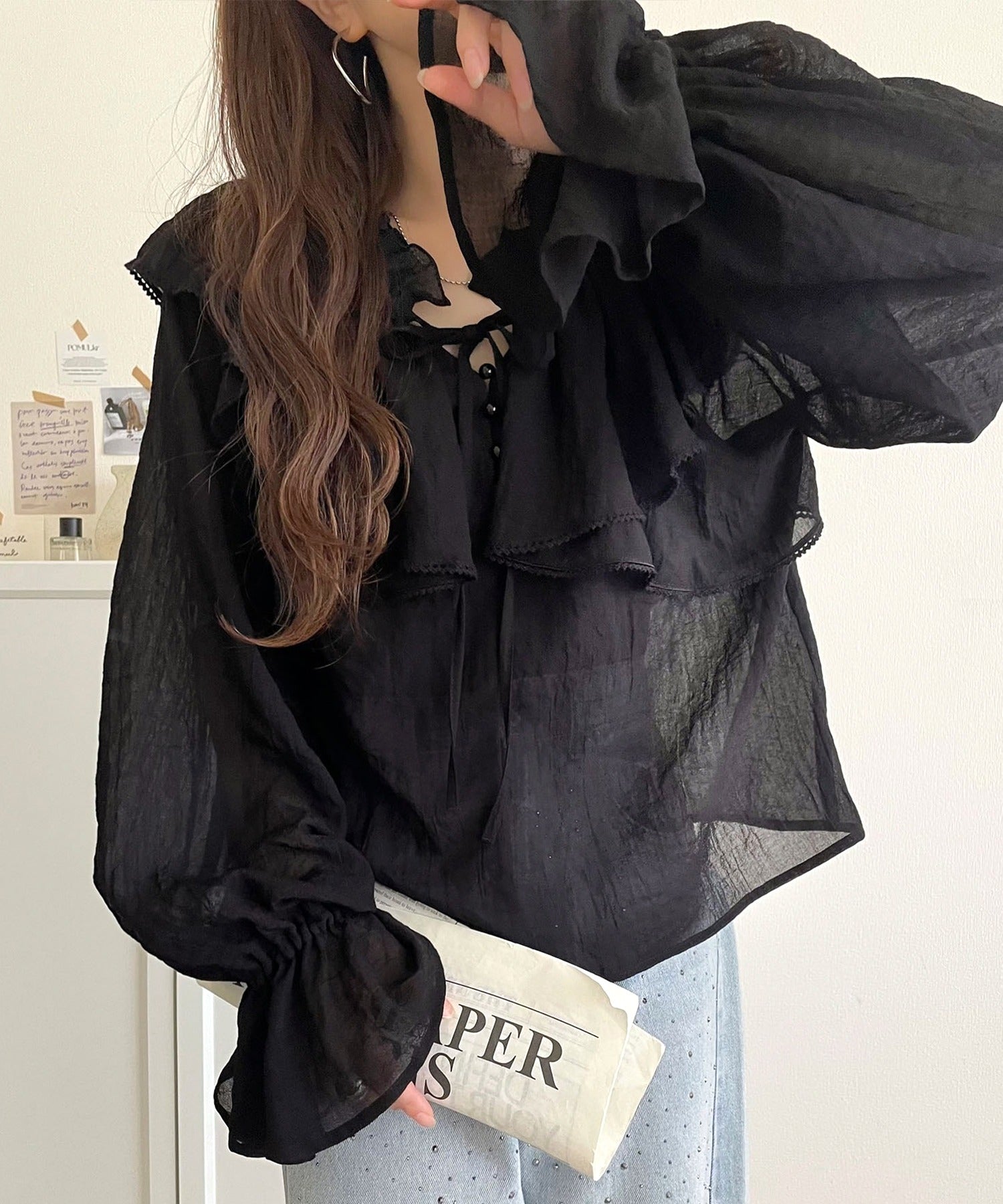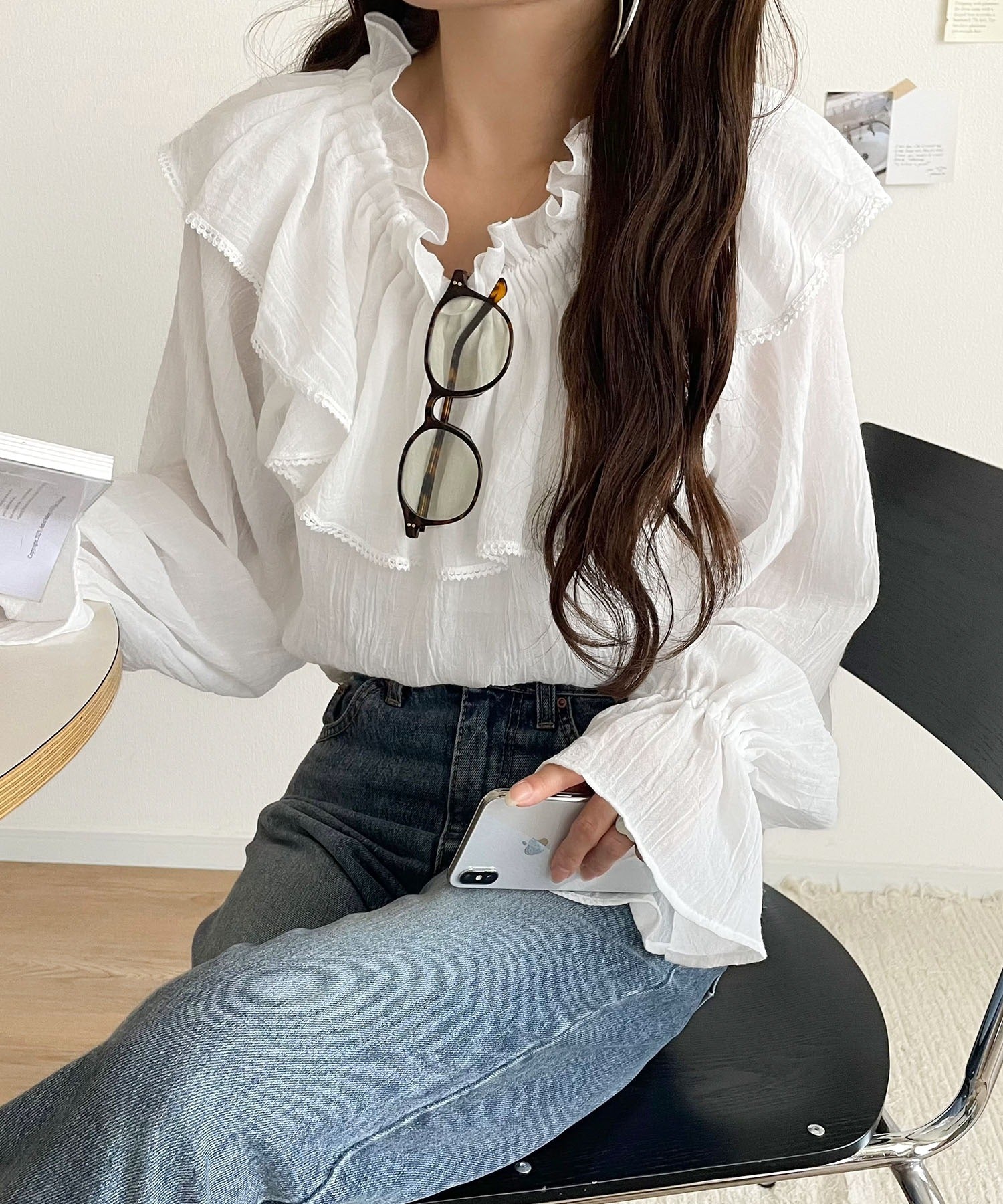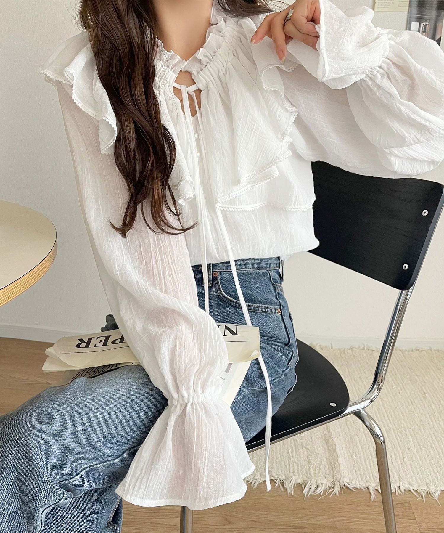 ふわっと揺れるフリルがポイントのフェミニンなブラウスです。