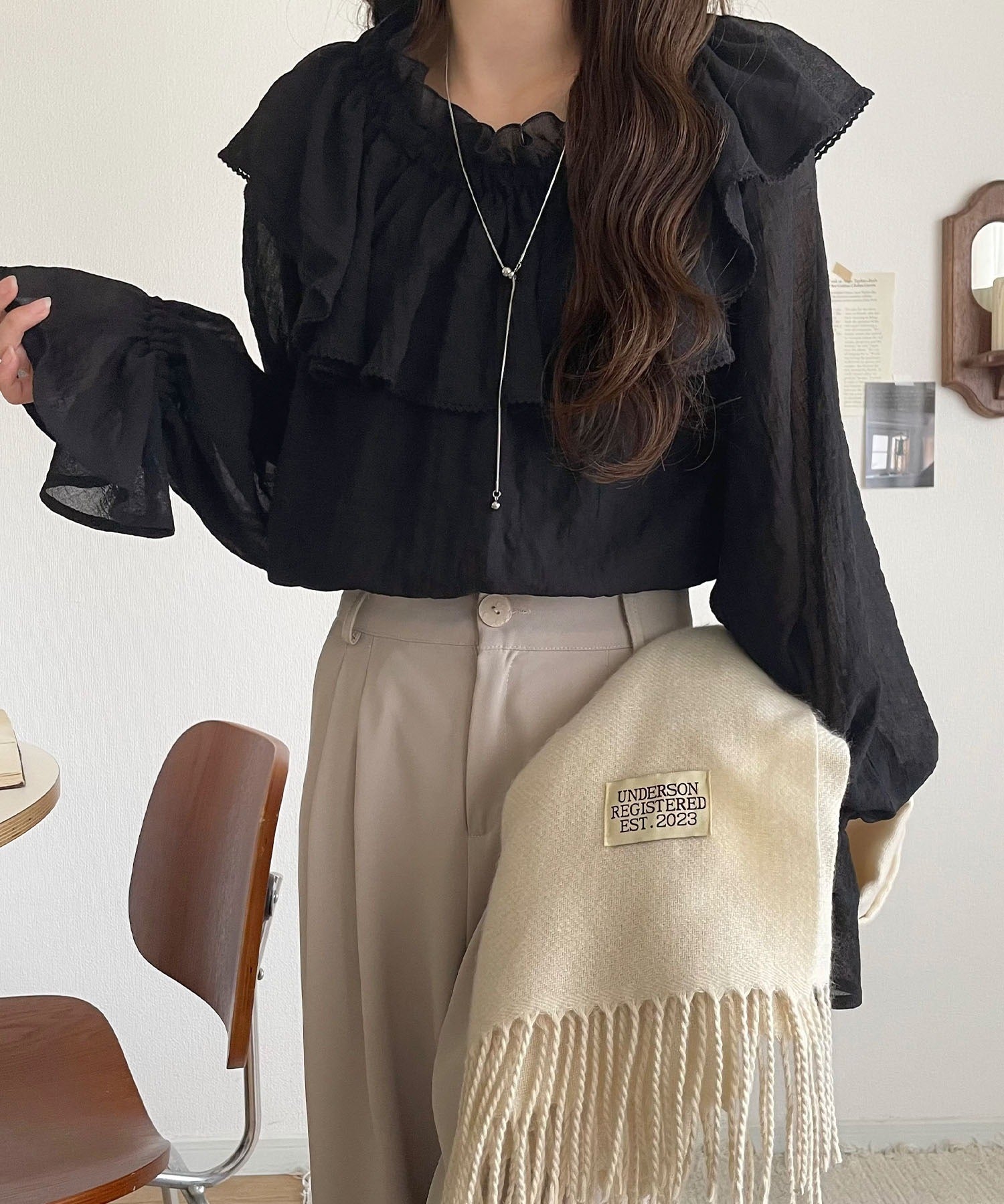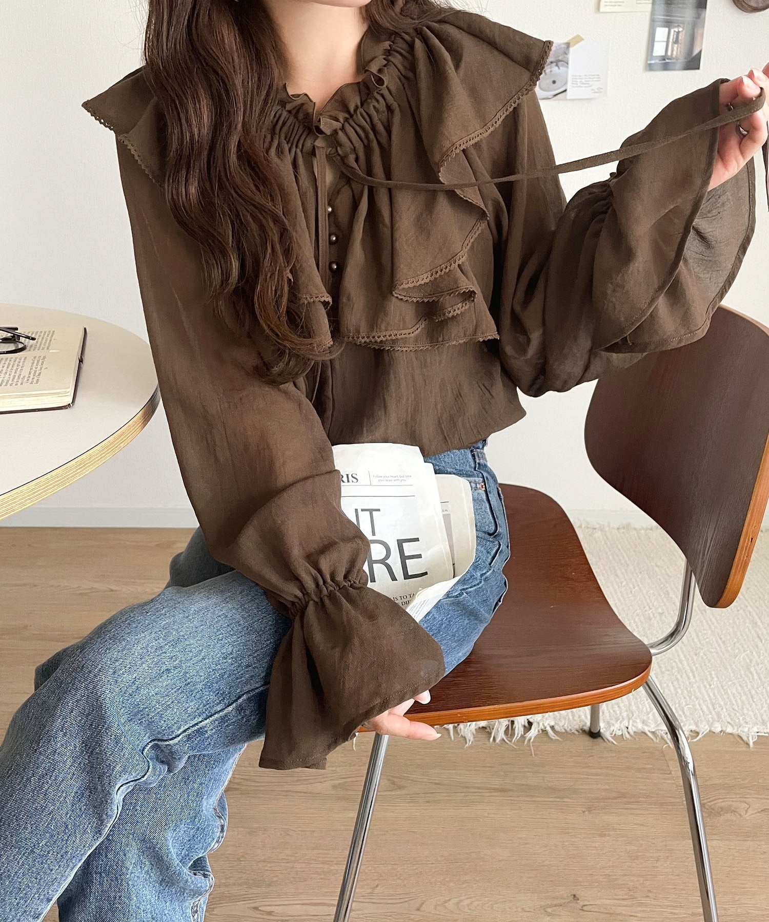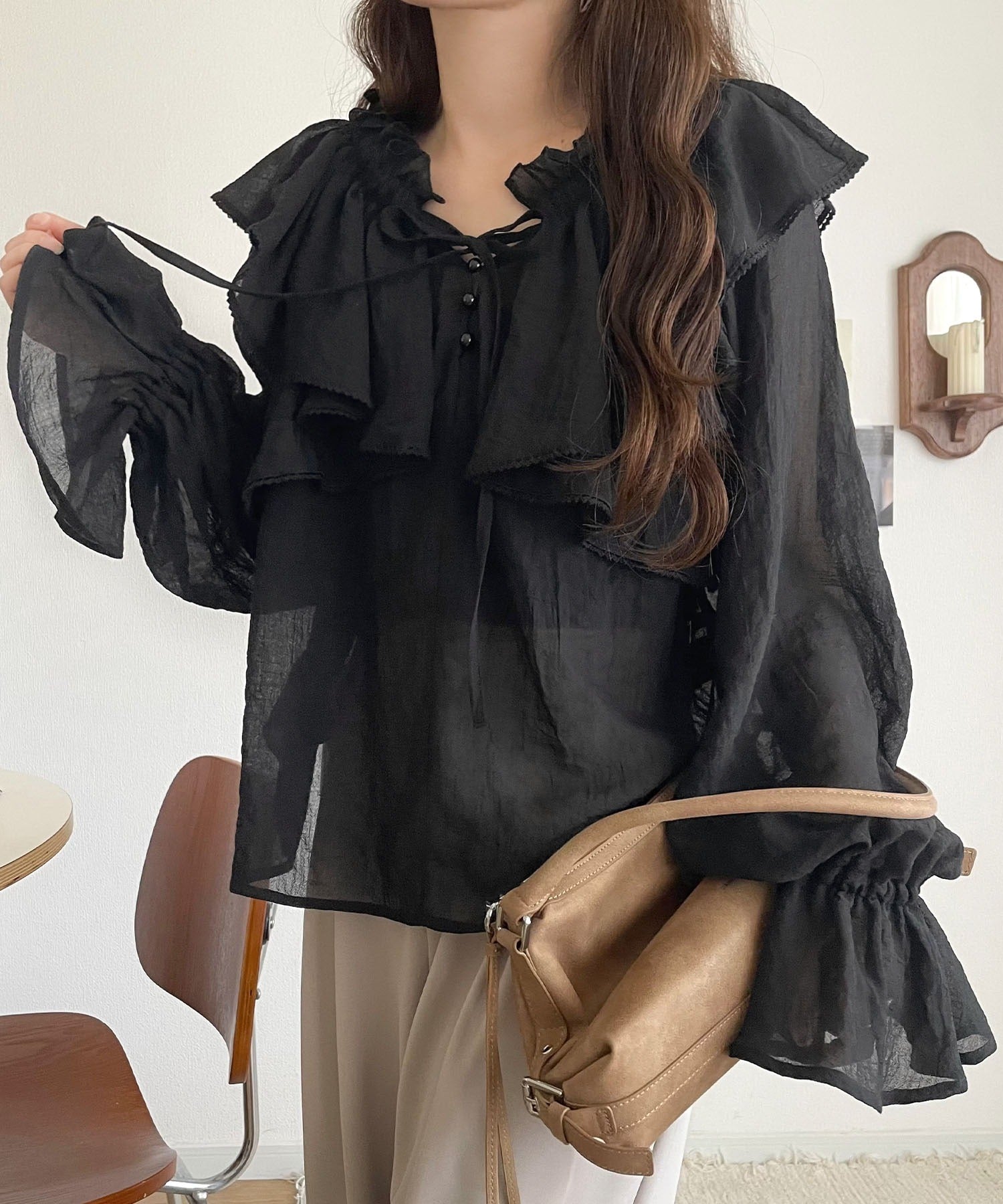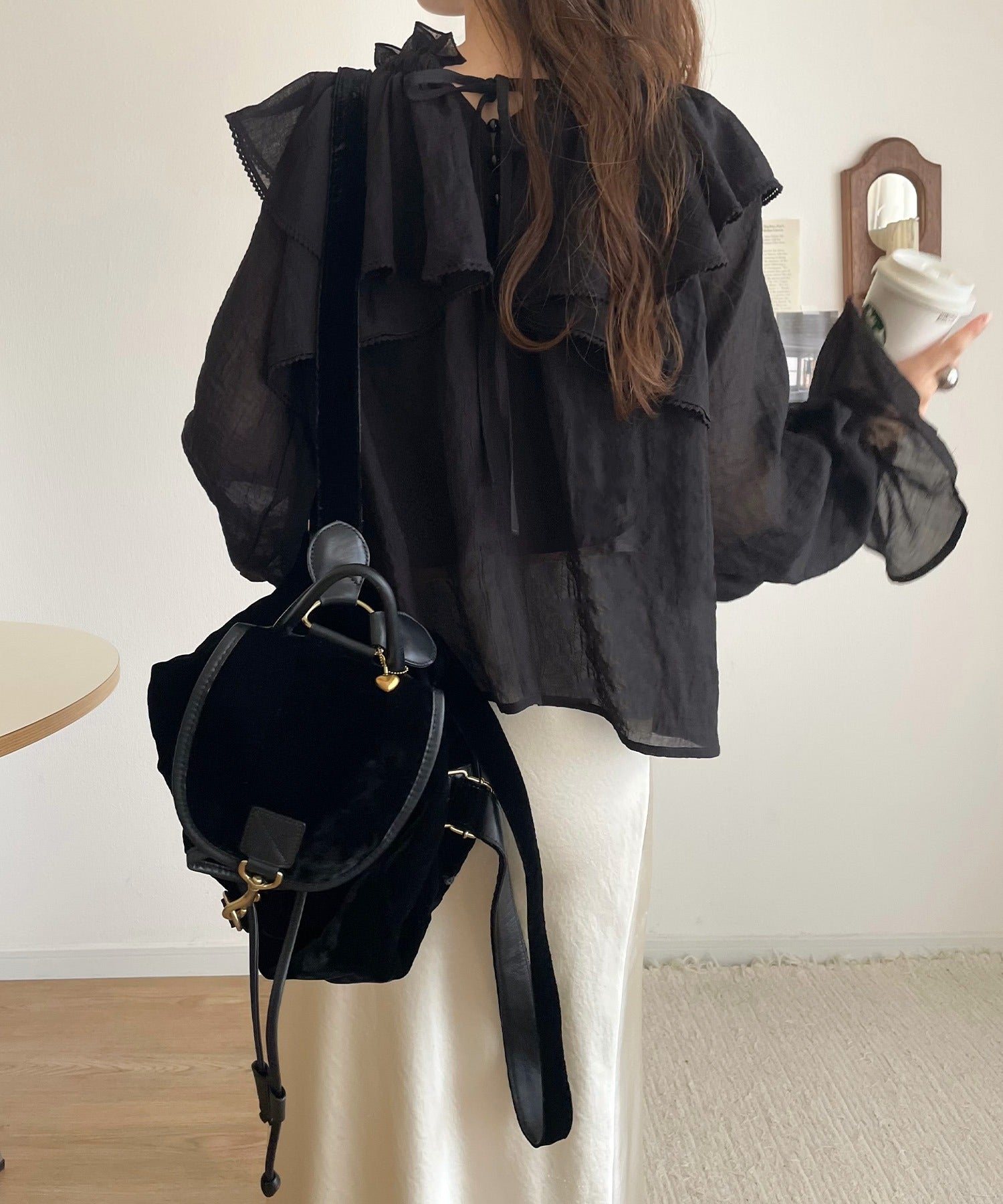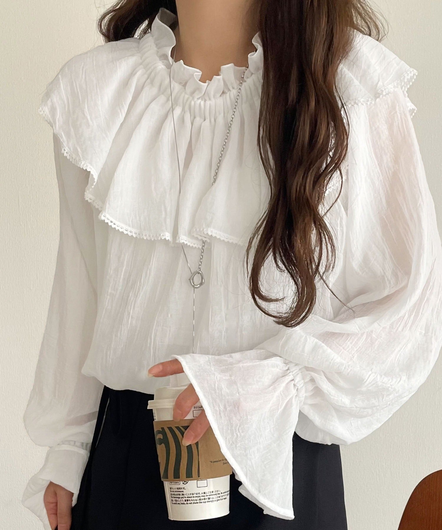 このブラウスは、前後2WAYデザインでラッフルデザインのフリル襟が特徴。