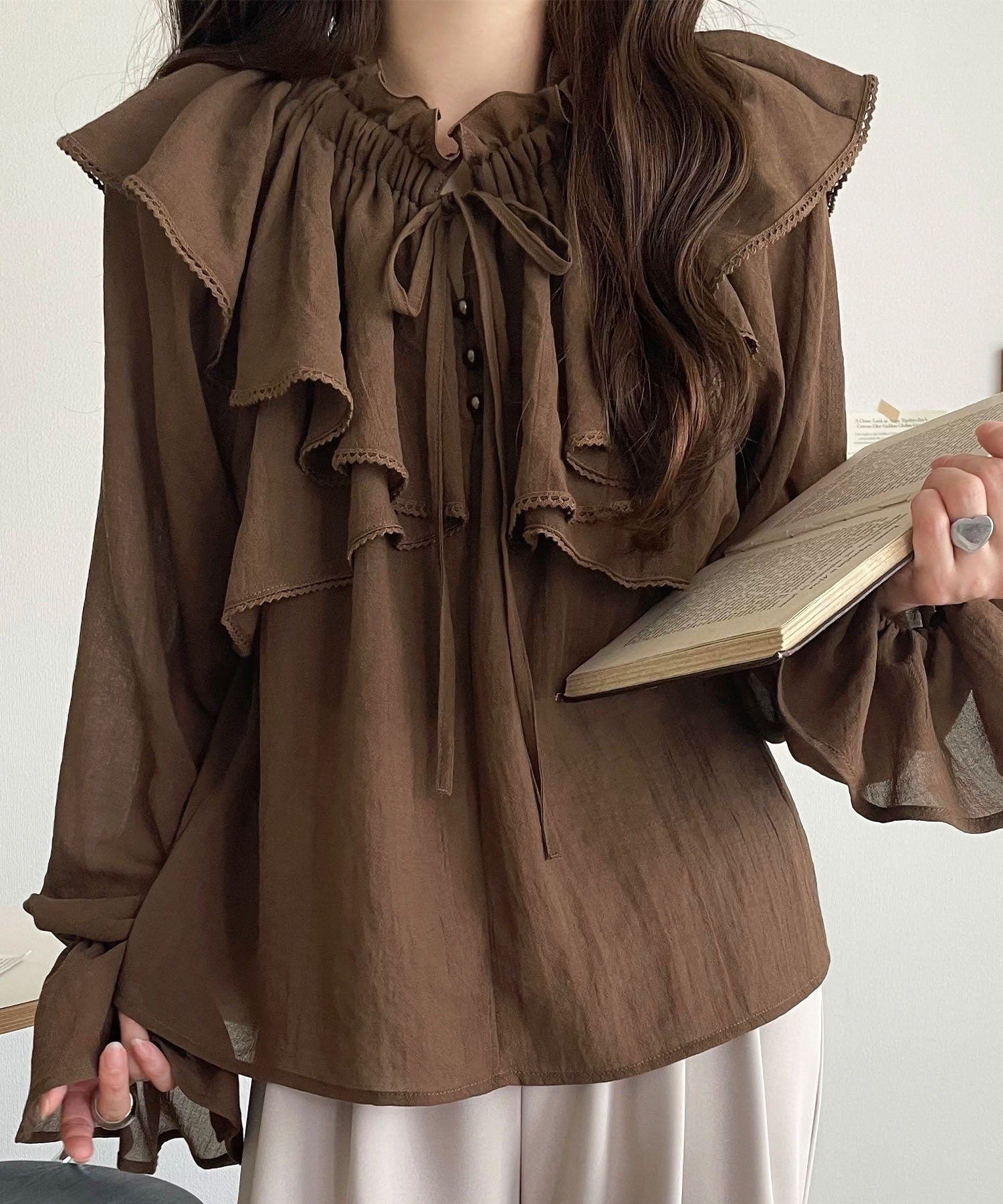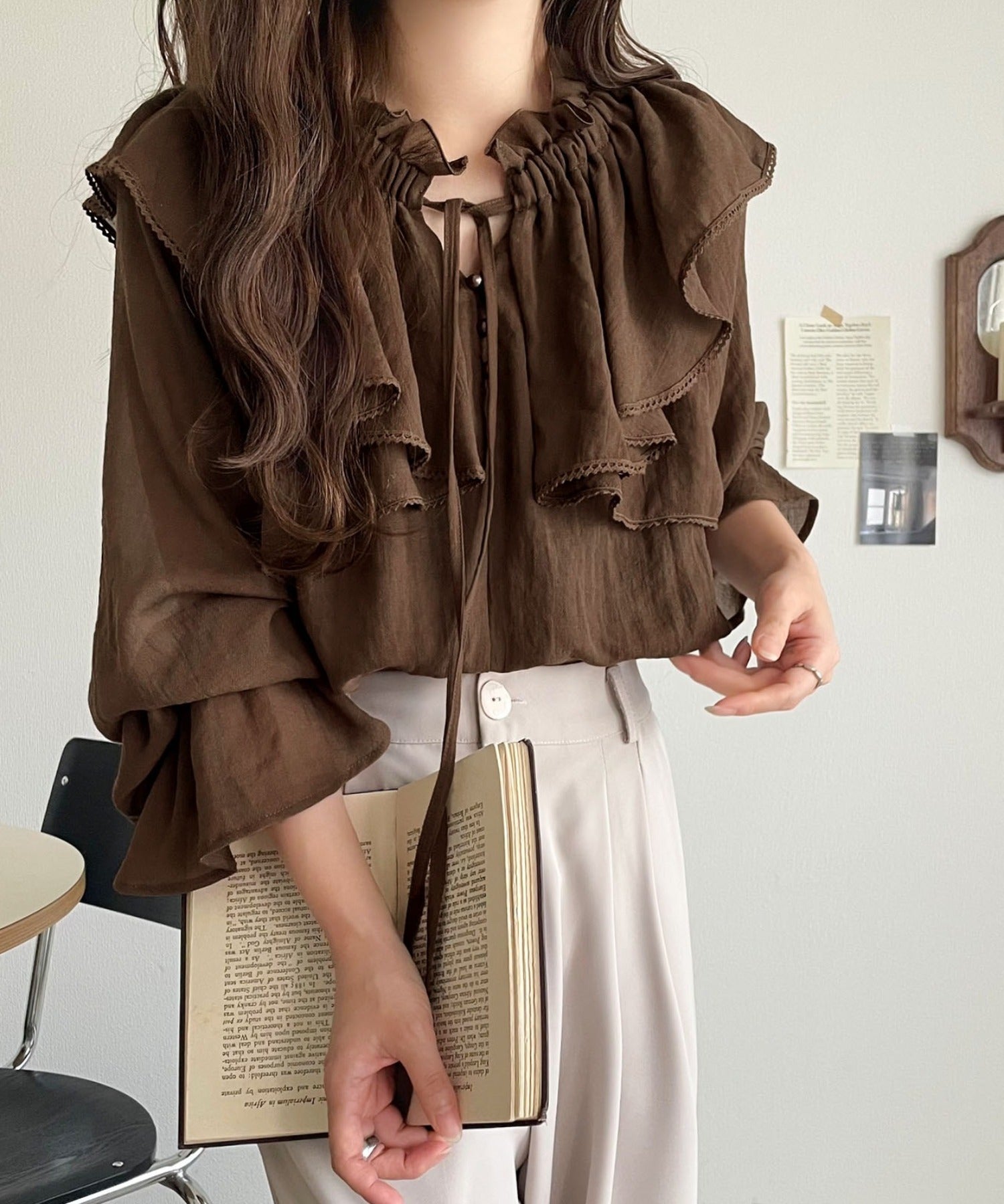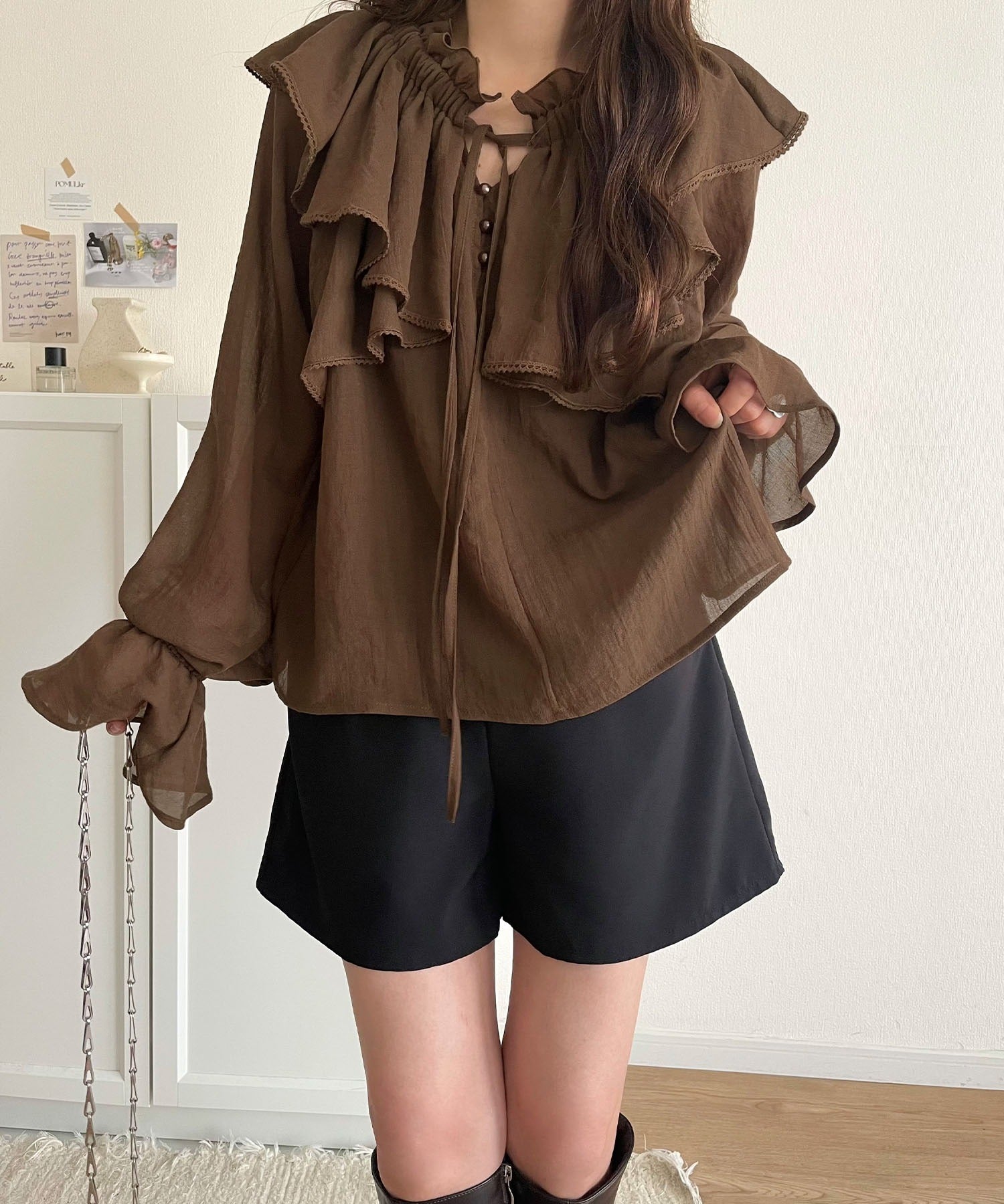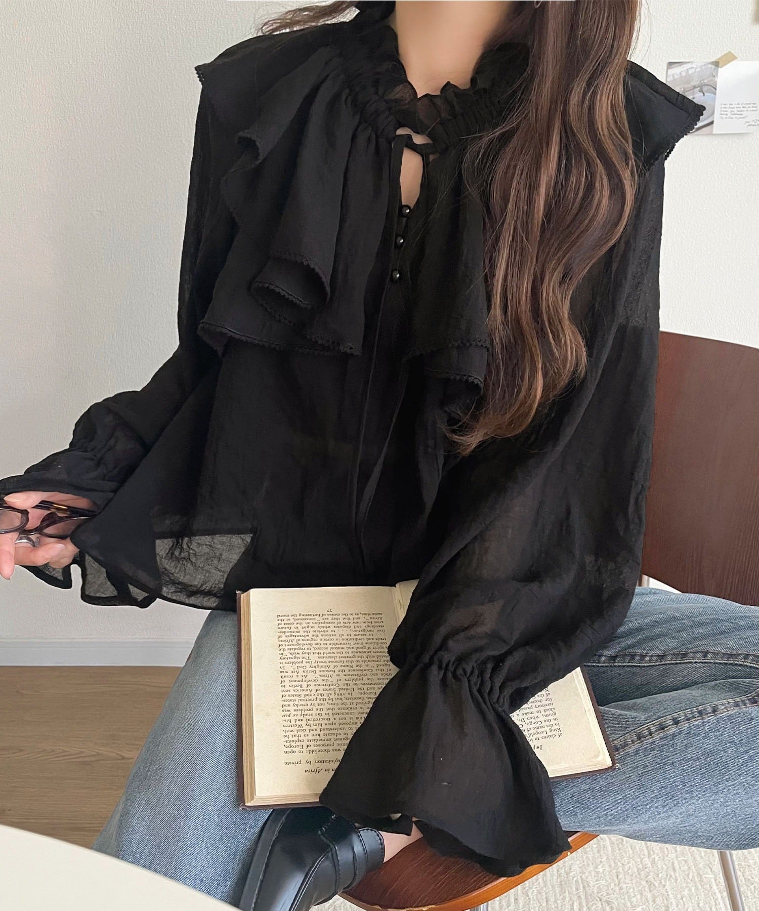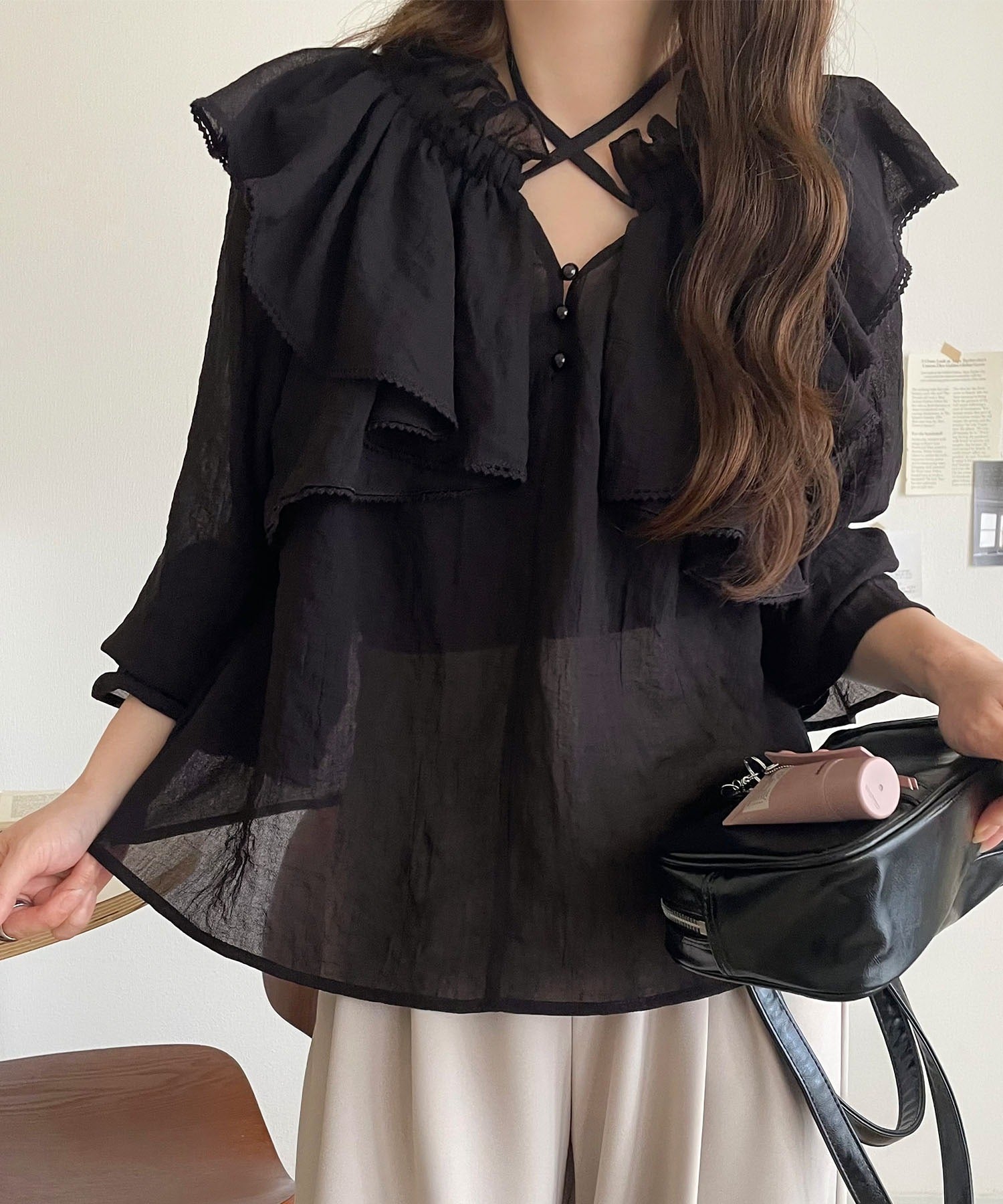 このブラウスは、前後2WAYデザインでラッフルデザインのフリル襟が特徴。