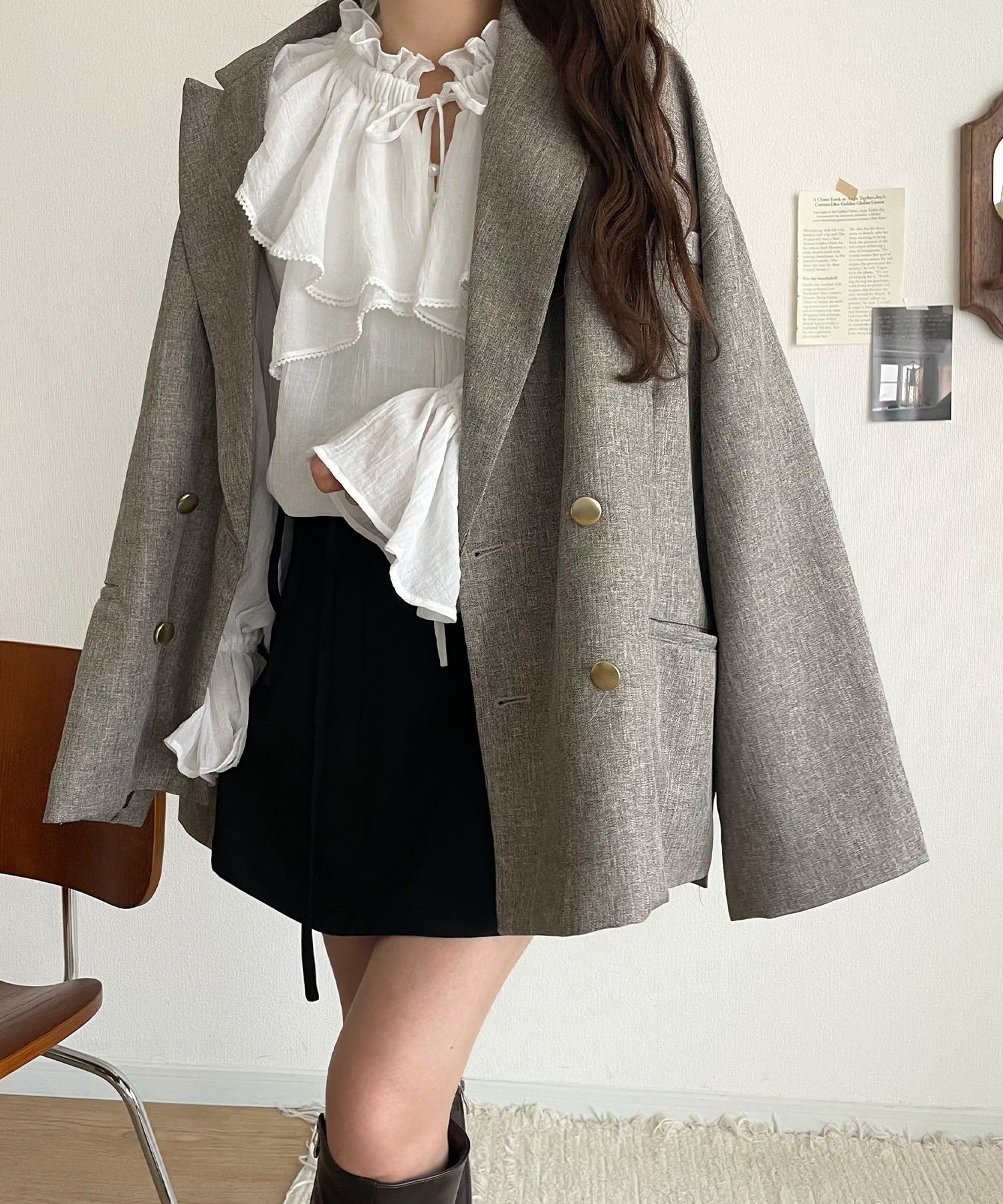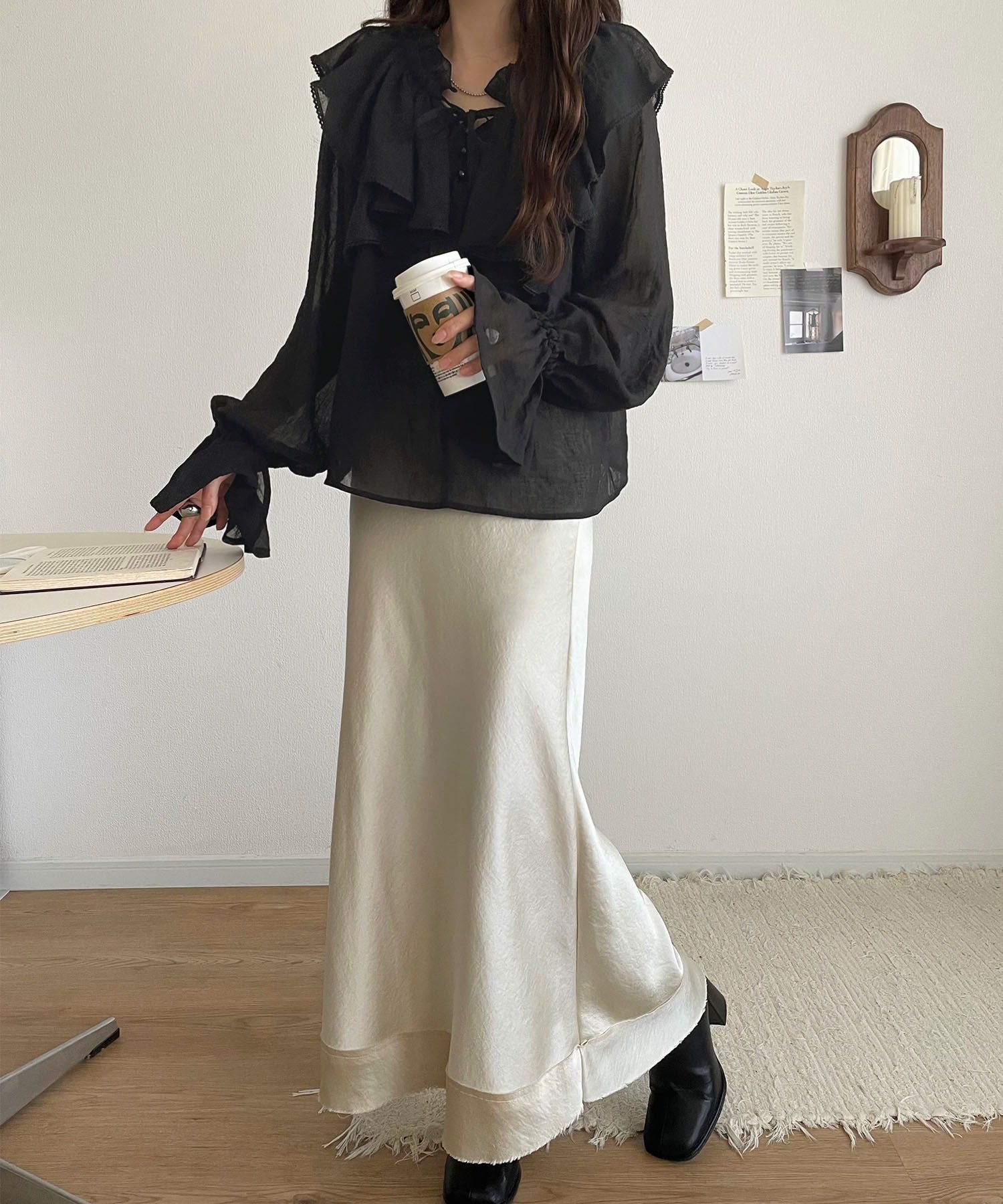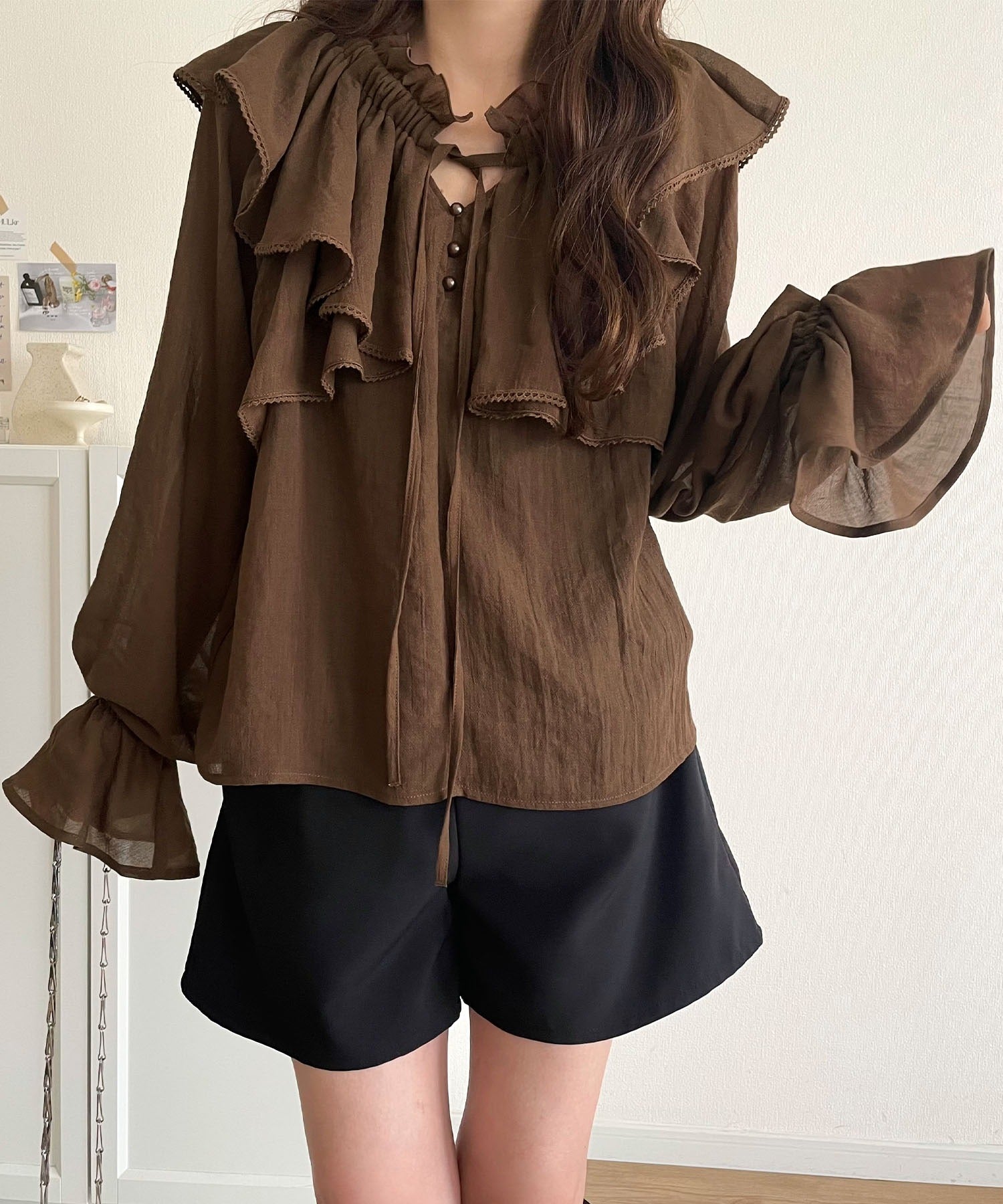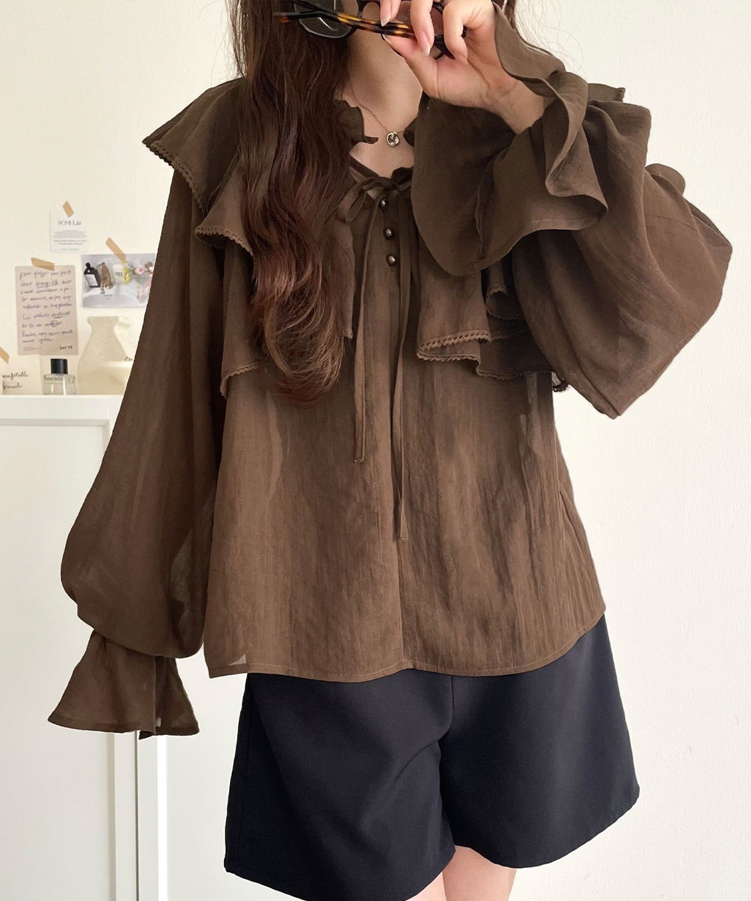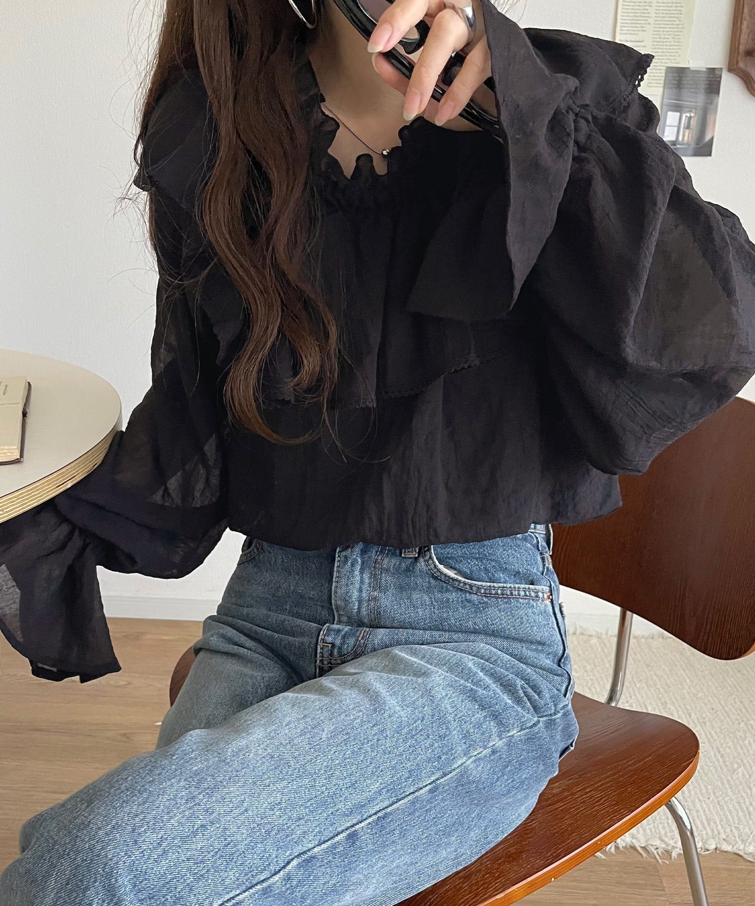 このブラウスは、前後2WAYデザインでラッフルデザインのフリル襟が特徴。
