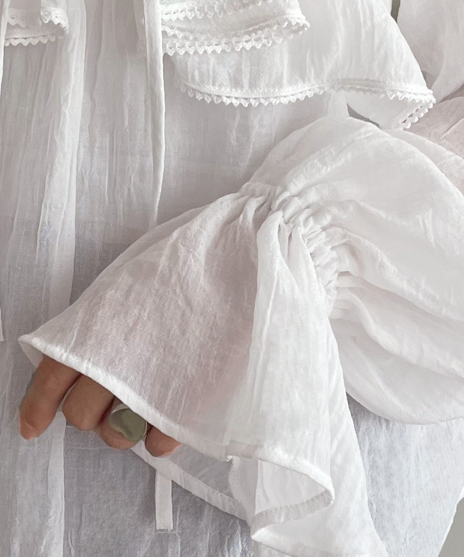 【mily bilet】ふんわりシルエットが魅せる、上品フェミニンスタイル。前後2WAYピコレース使いフリル襟コットンボイルブラウス mi1019099