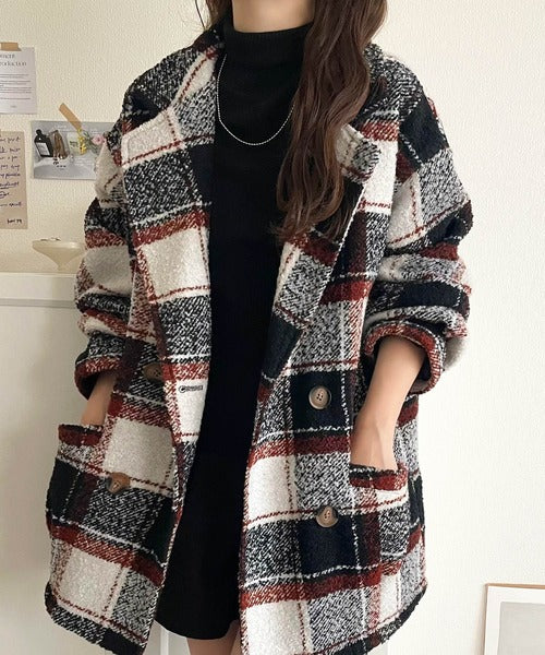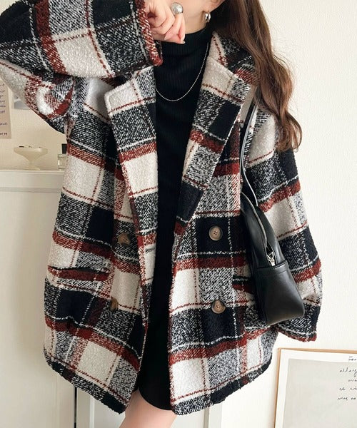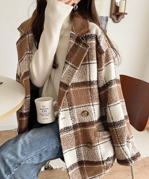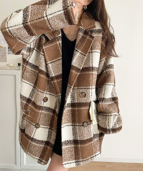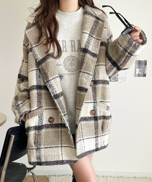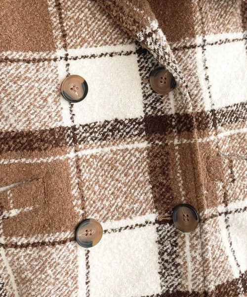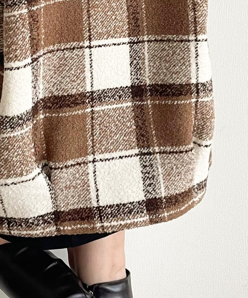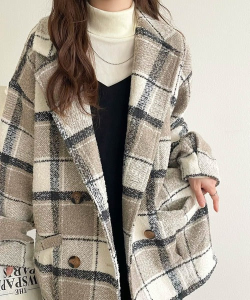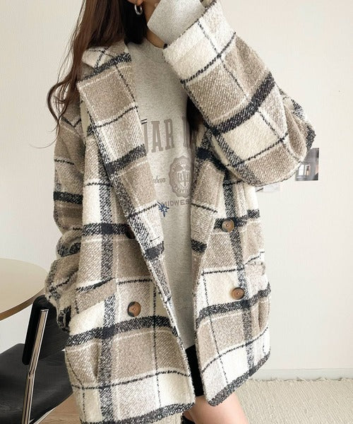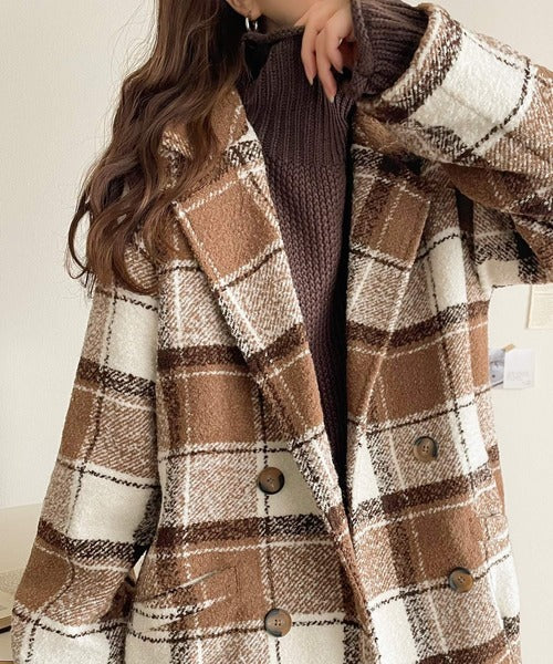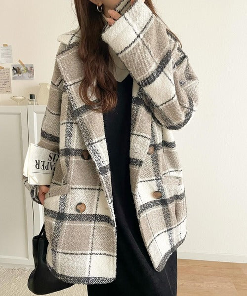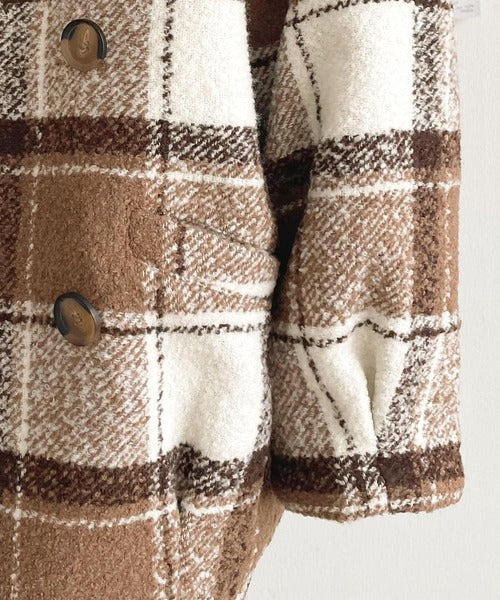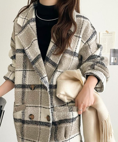 【mily bilet】冬のコーデを引き立てる。起毛ブークレチェック柄コクーンシルエットダブルジャケットコート mi1019109