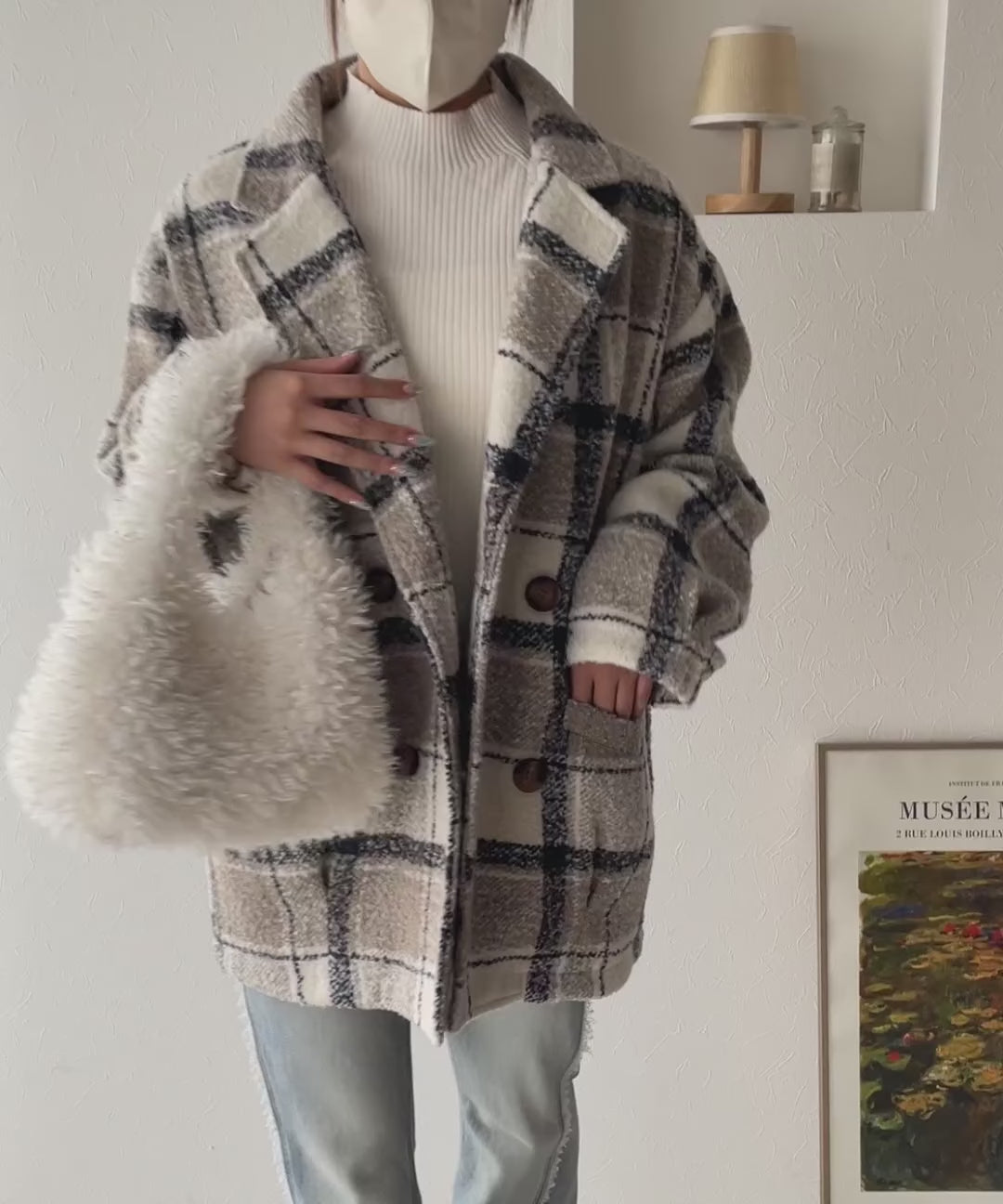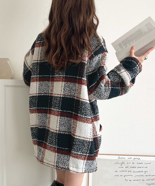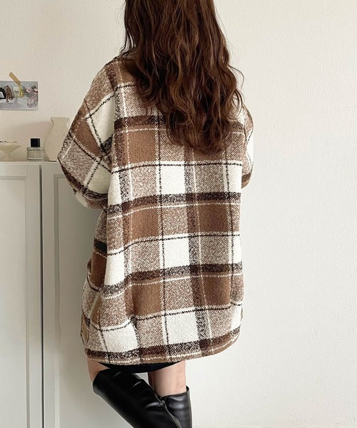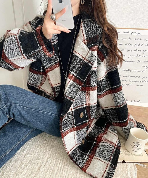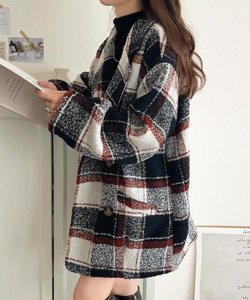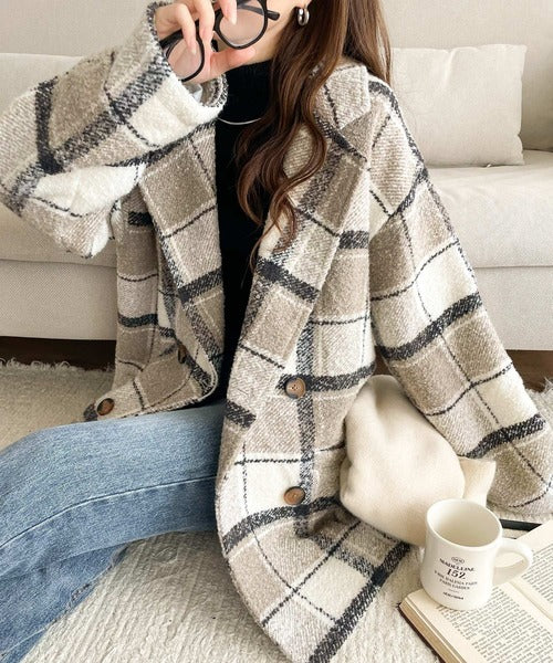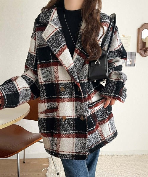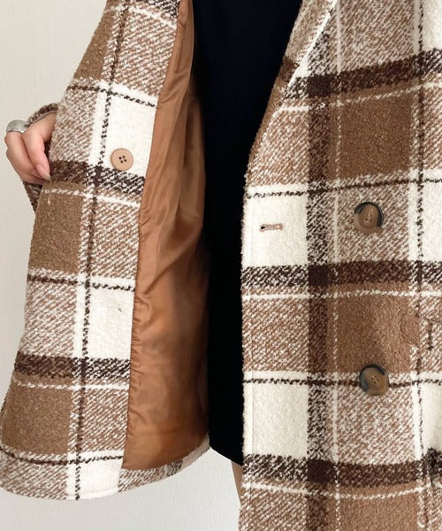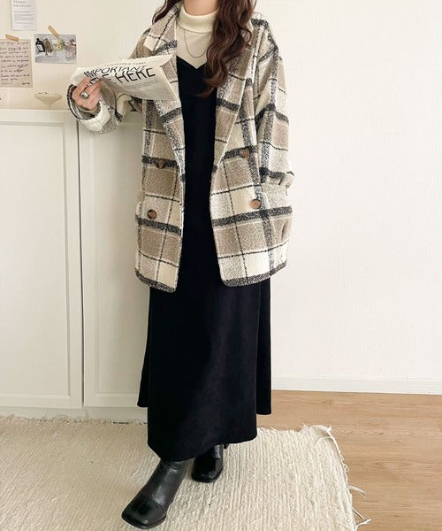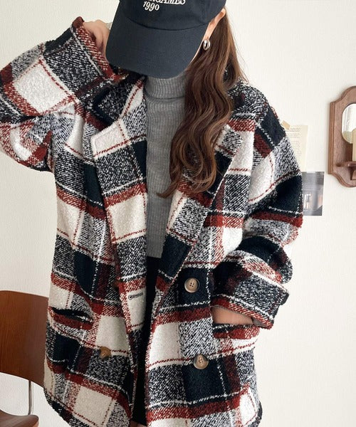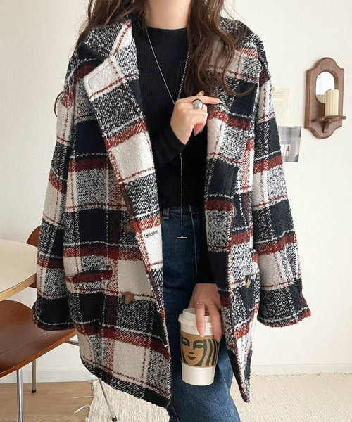 【mily bilet】冬のコーデを引き立てる。起毛ブークレチェック柄コクーンシルエットダブルジャケットコート mi1019109