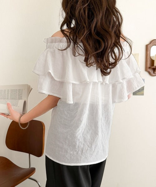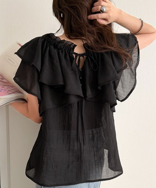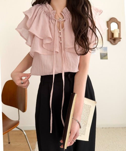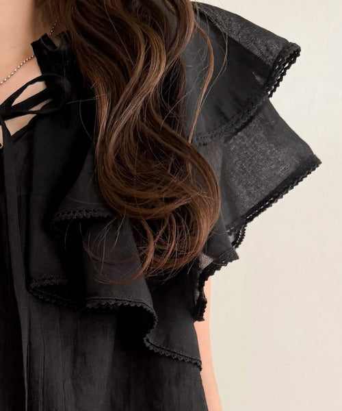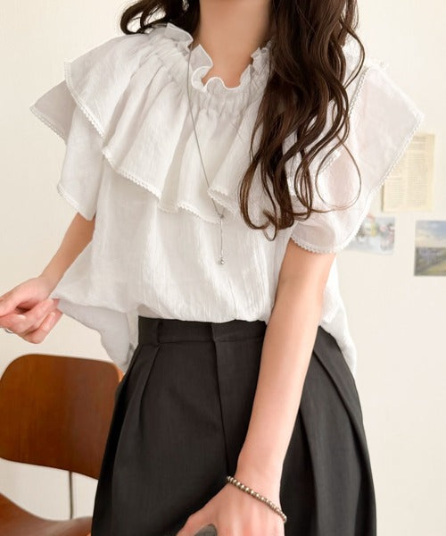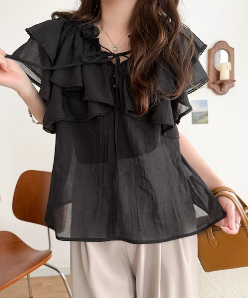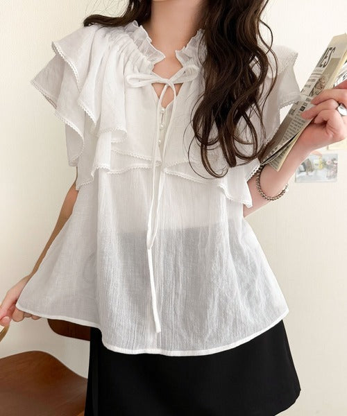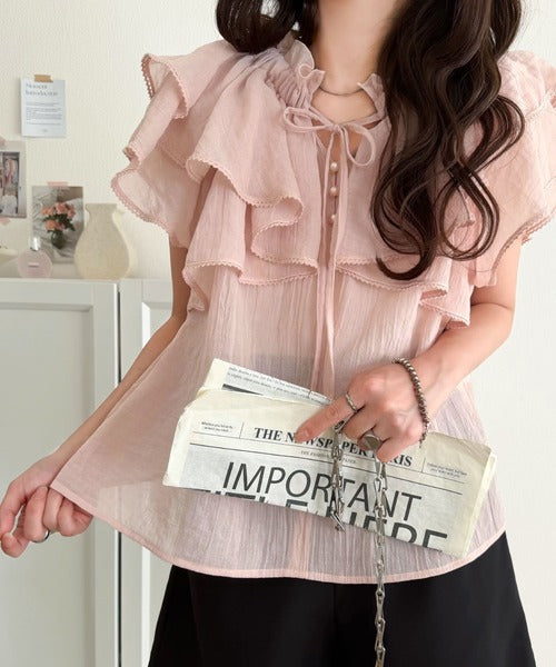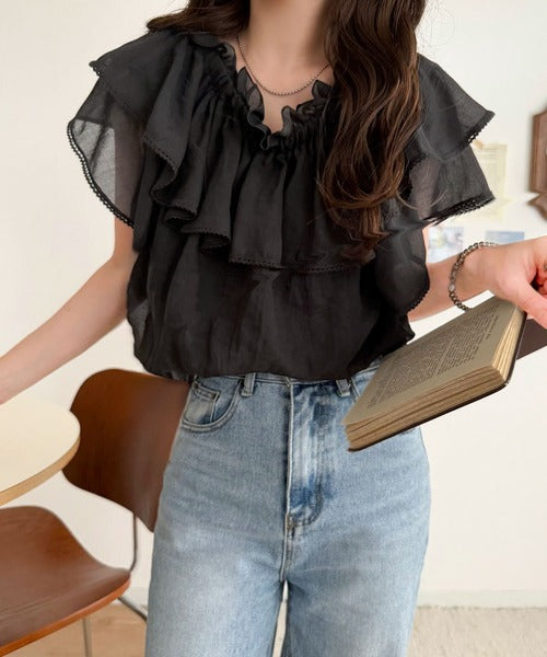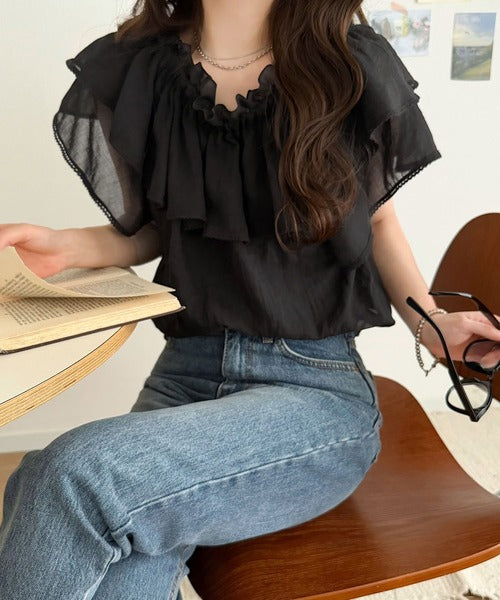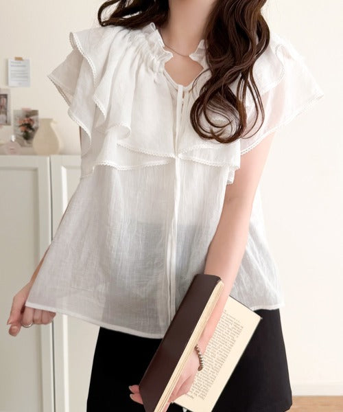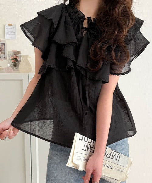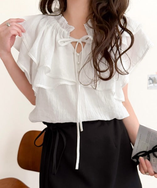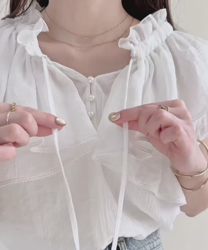 甘すぎない大人のラッフルフリルで360度どこから見ても可愛いブラウス。