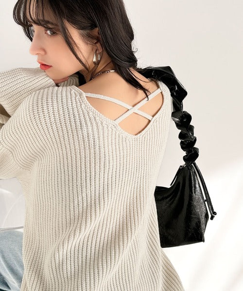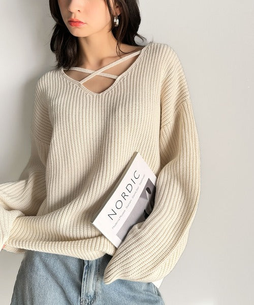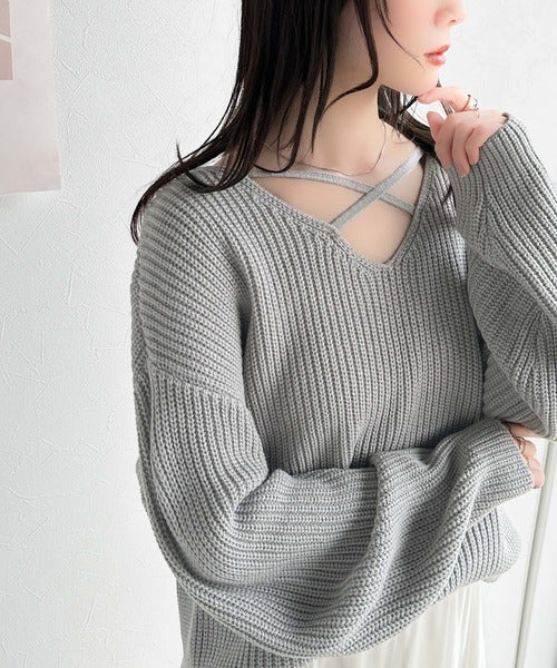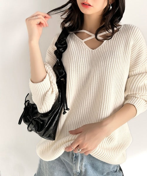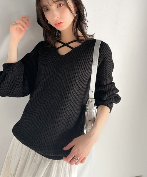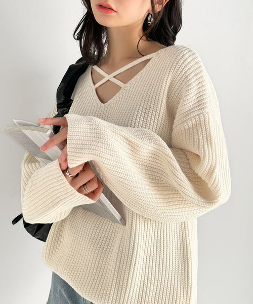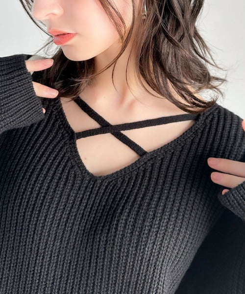 クロスデザインのネックを前にすれば、デコルテを美しく見せ