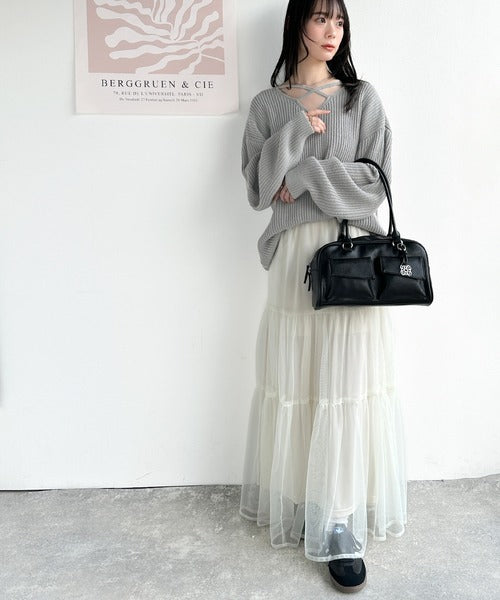 パールやピアスを身に着けてショルダーバッグをアクセントにします!