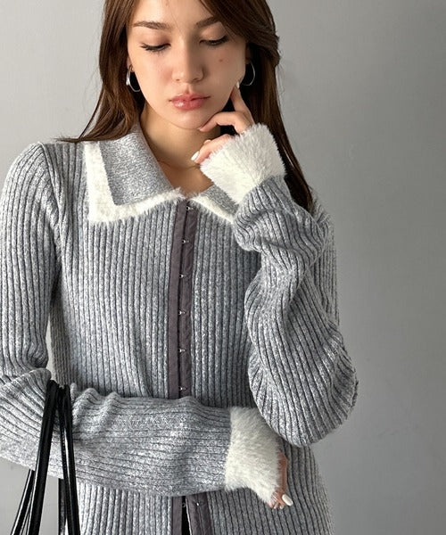 【mily bilet】レイヤード風で魅せる。異素材ダブル襟デザインリブニット素材フロントフックカーディガン(長袖) mi1029174