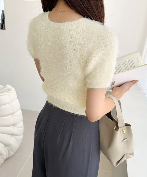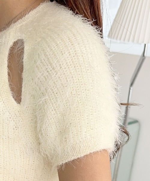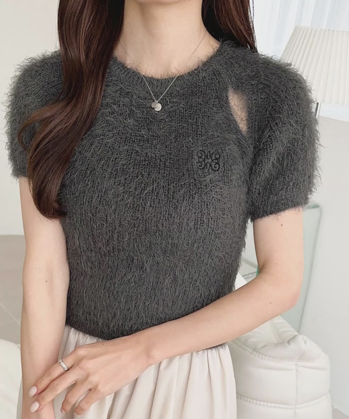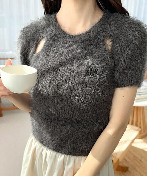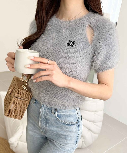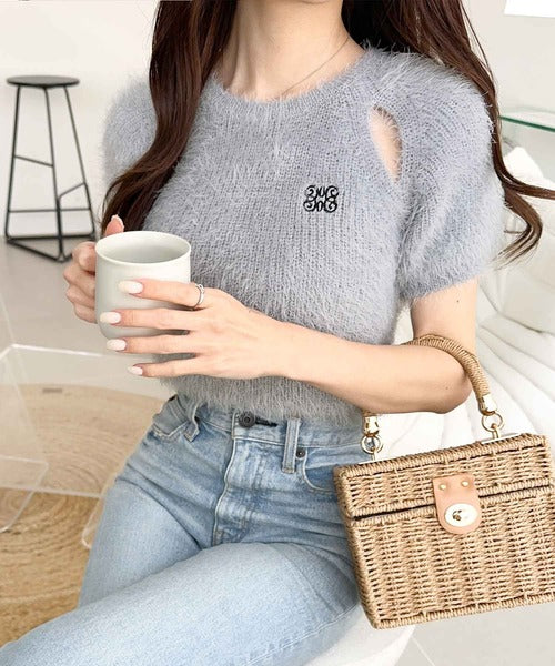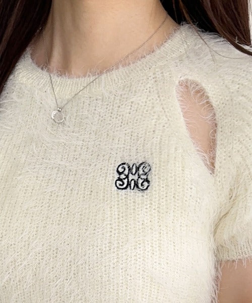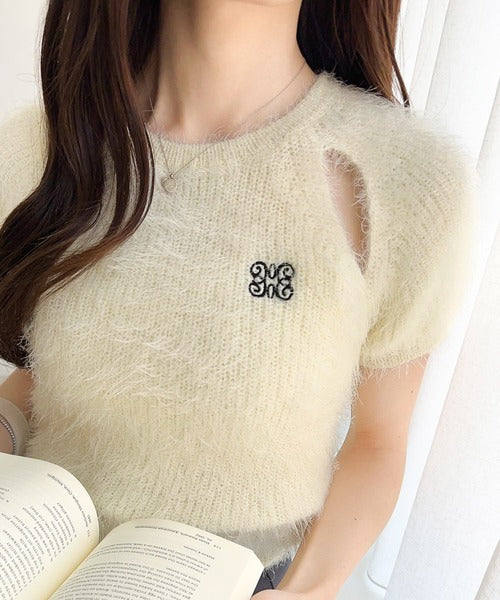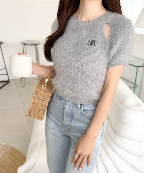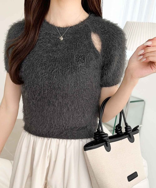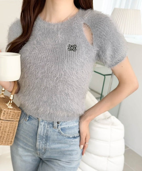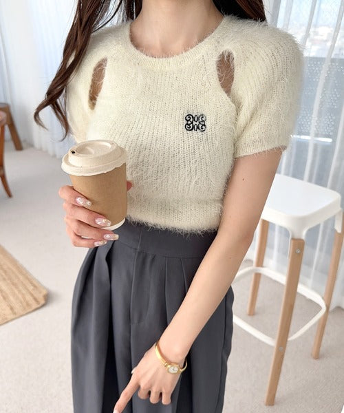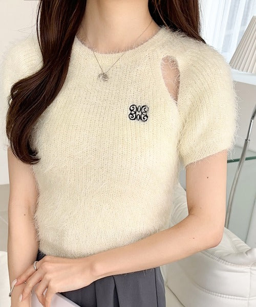 胸刺繍肩スリット半袖シャギーニットプルオーバーの登場!!