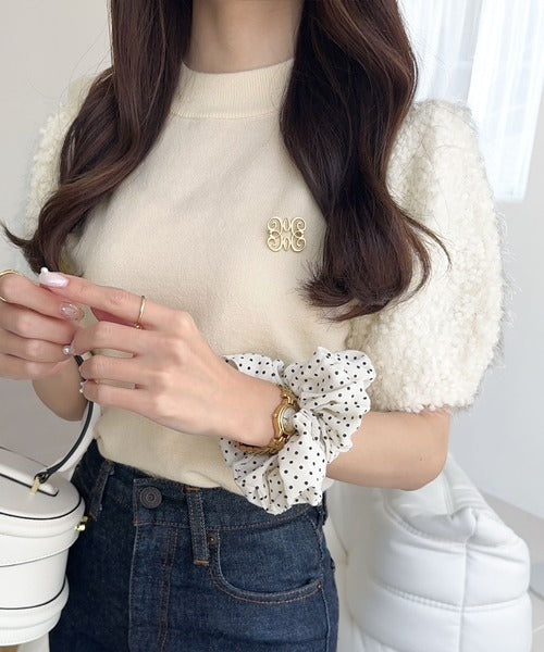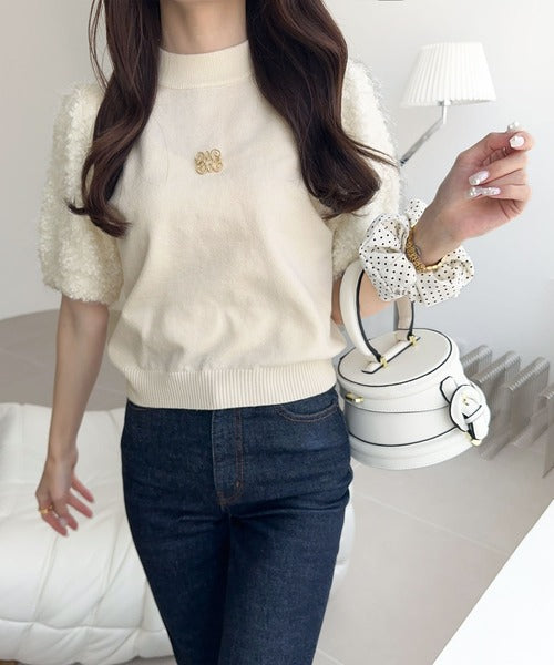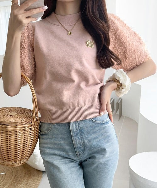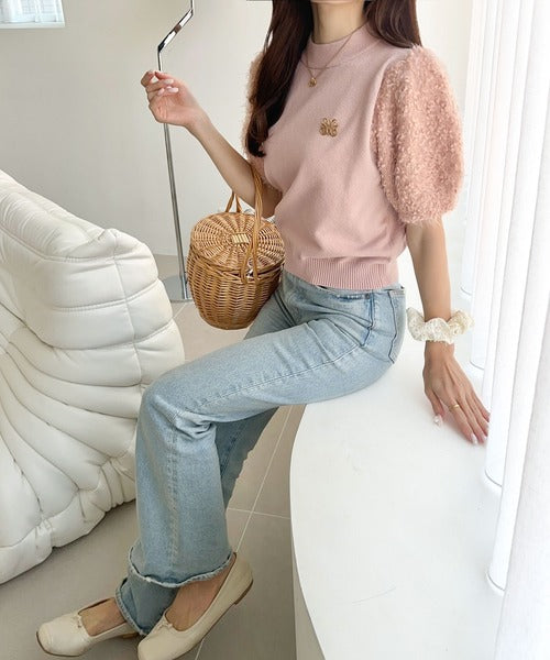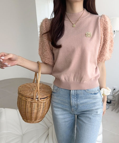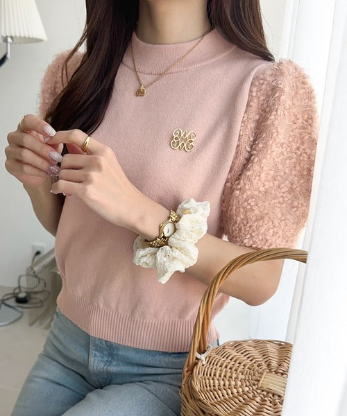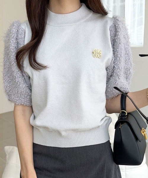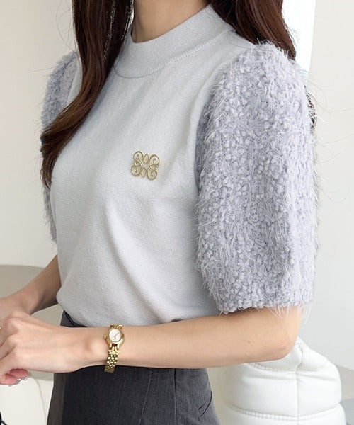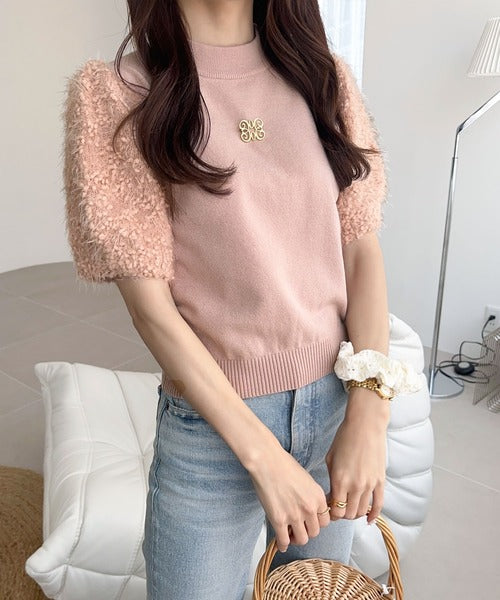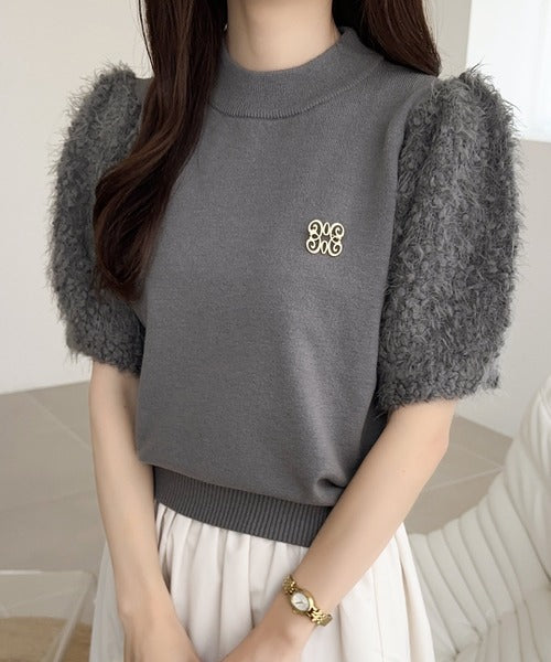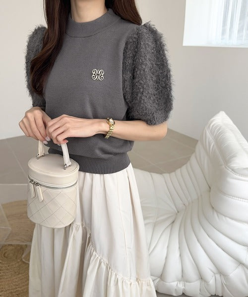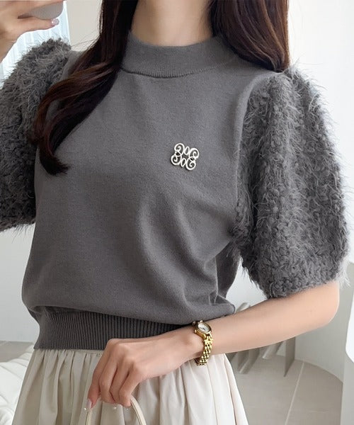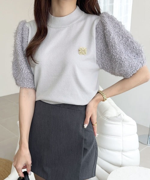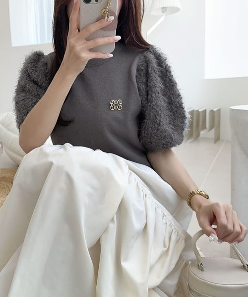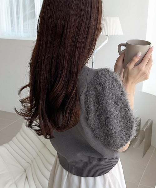 ふわふわのシャギーで切り替えたパフスリーブが印象的なデザイン。