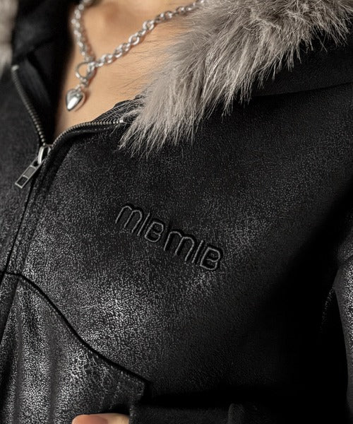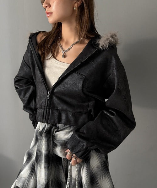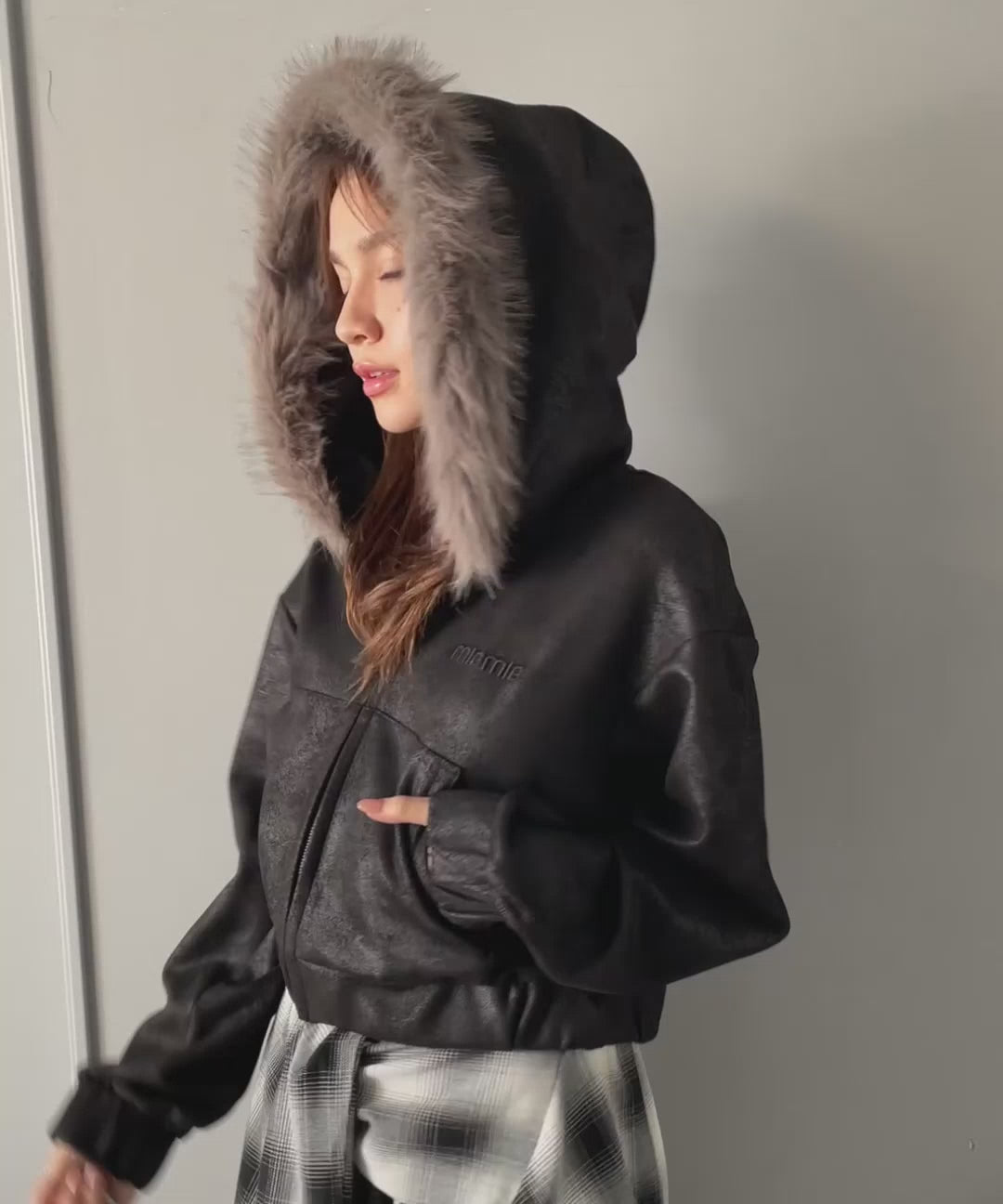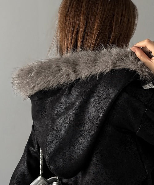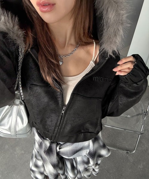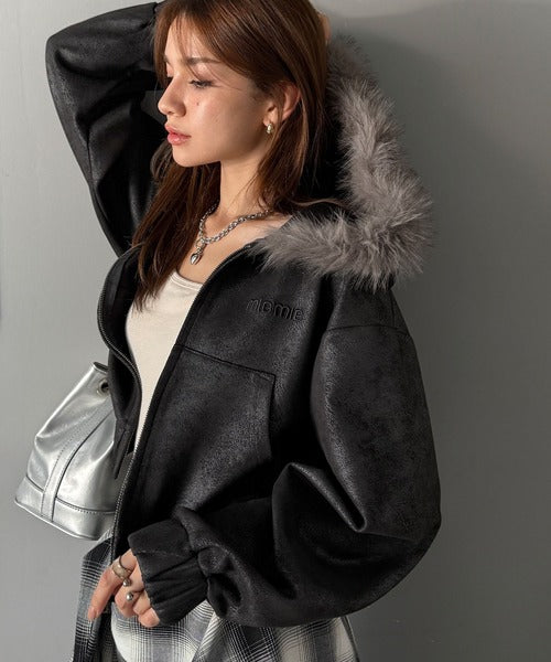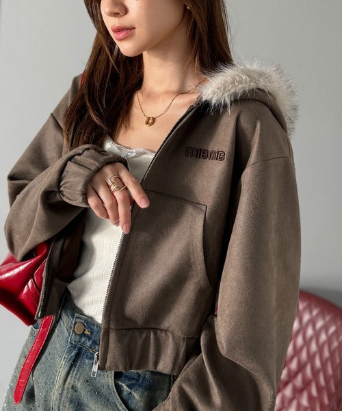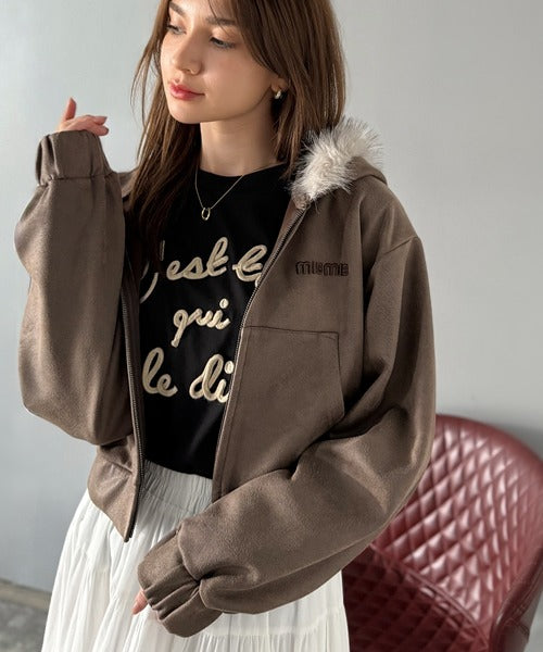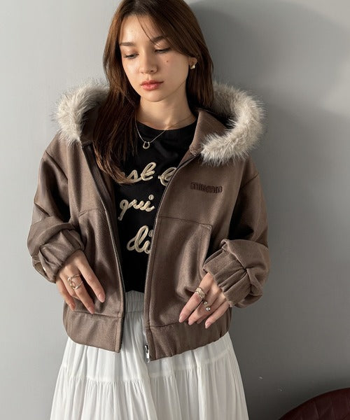 【mily bilet】ふわっと華やか、羽織って甘辛♪フードファー付きスエードポンチパーカー(ショート丈) mi1359029