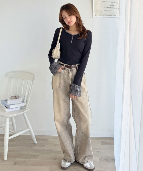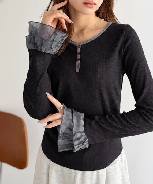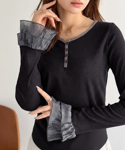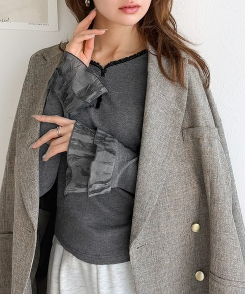 袖口のエンボス加工フリルとレースが上品に映えるインナートップス。
