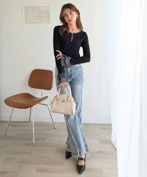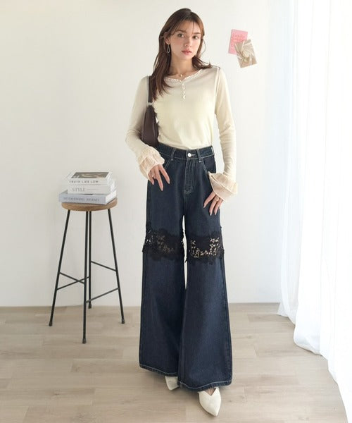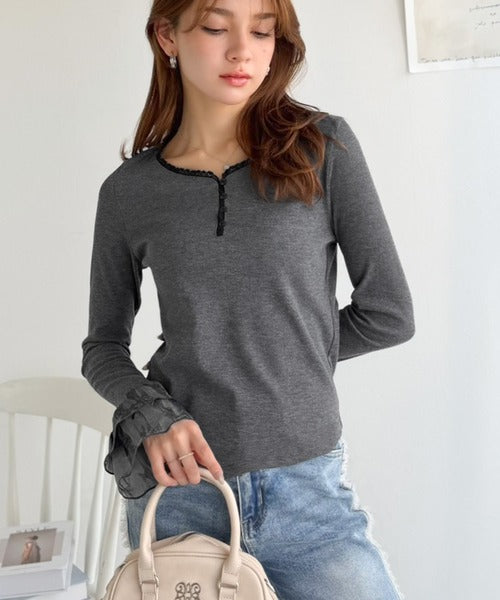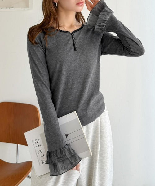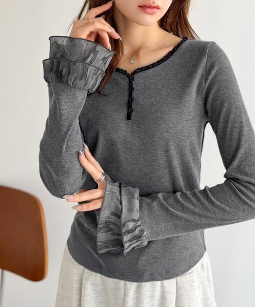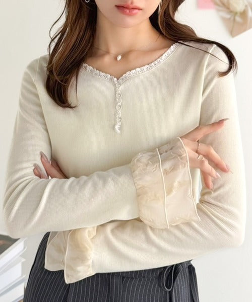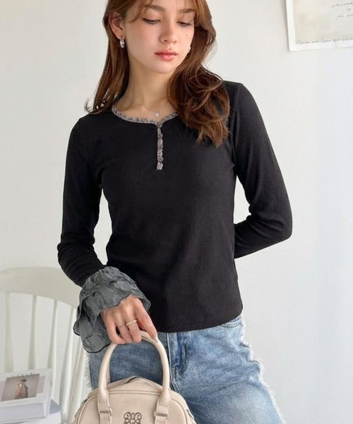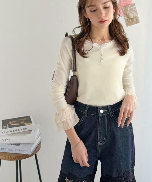 【mily bilet】大人フェミニンを叶える。袖フリルレースヘンリーネックトップス mi1359050