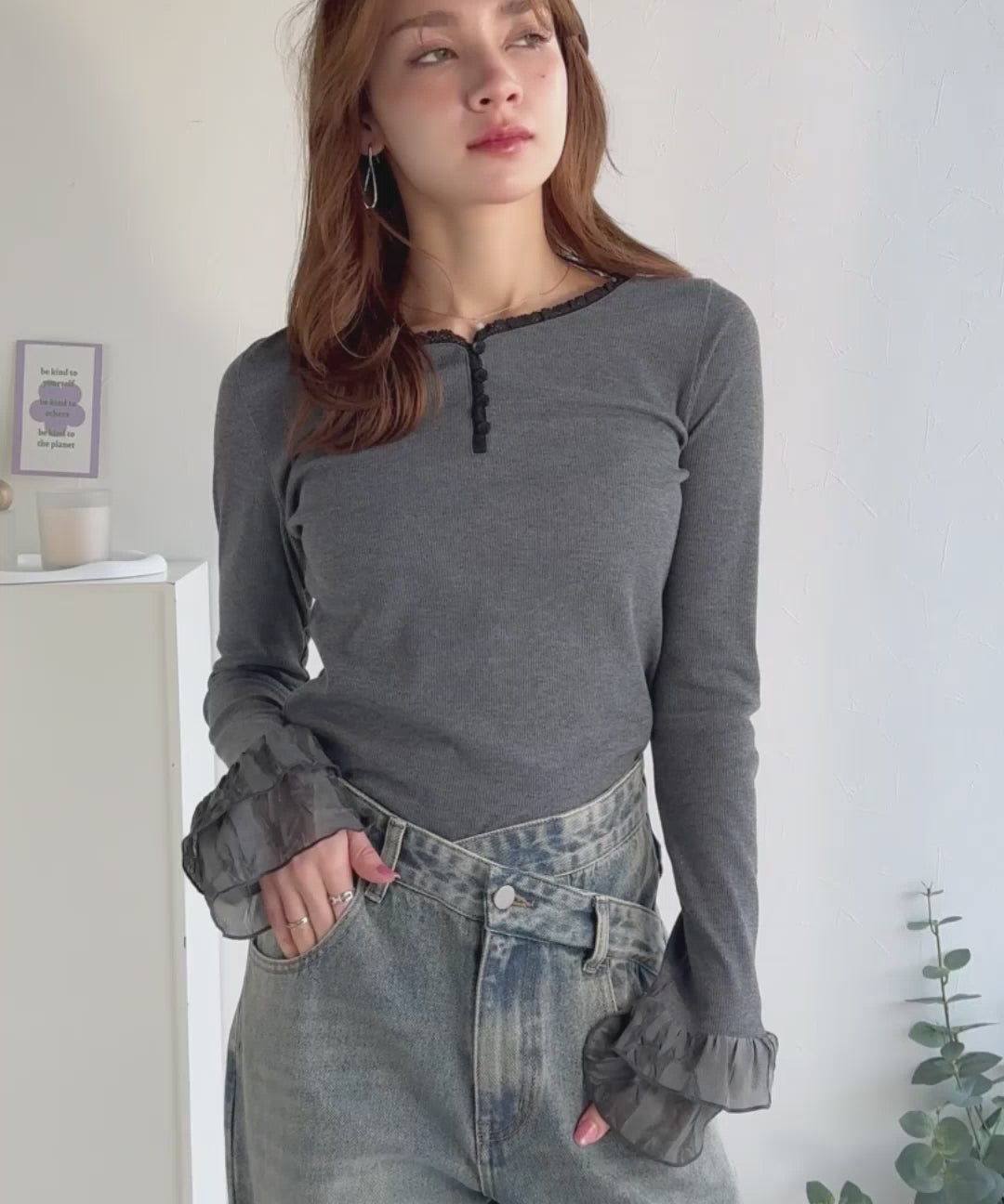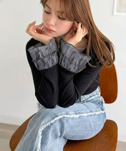 袖口にフリルをあしらい、大人フェミニンな雰囲気をプラス。